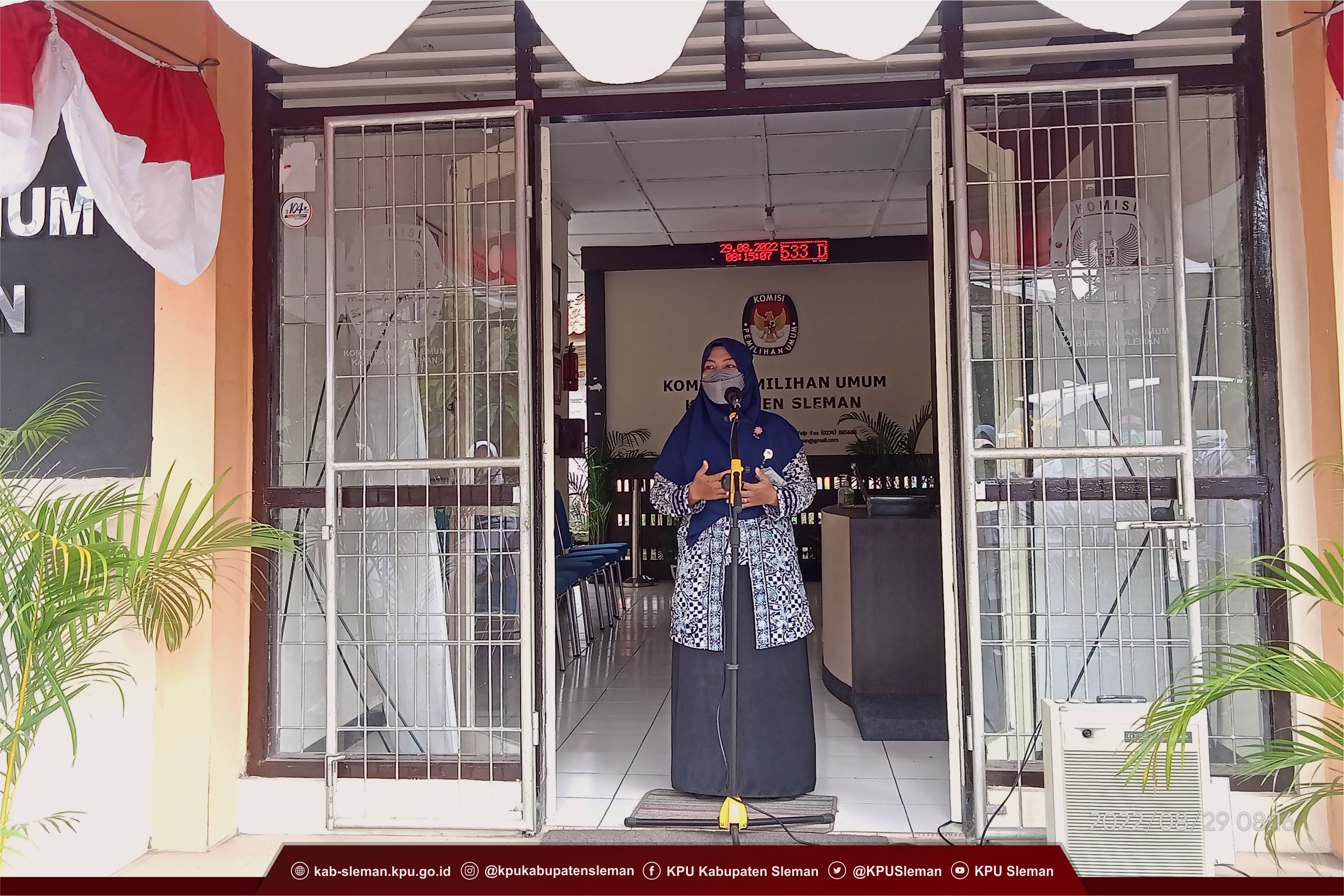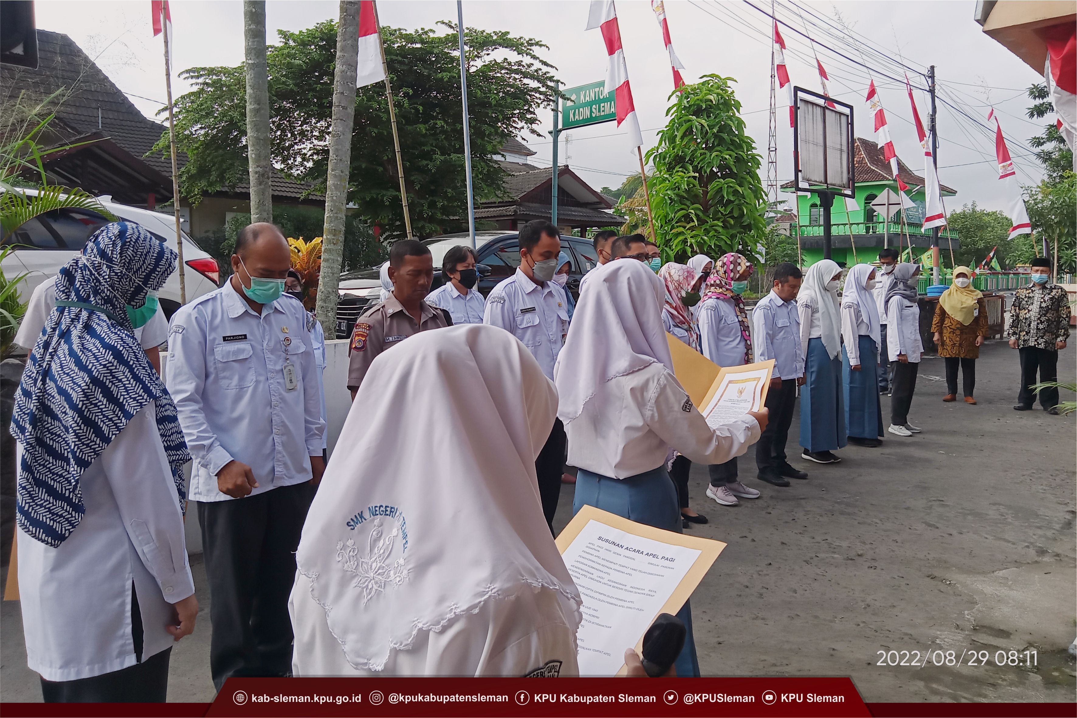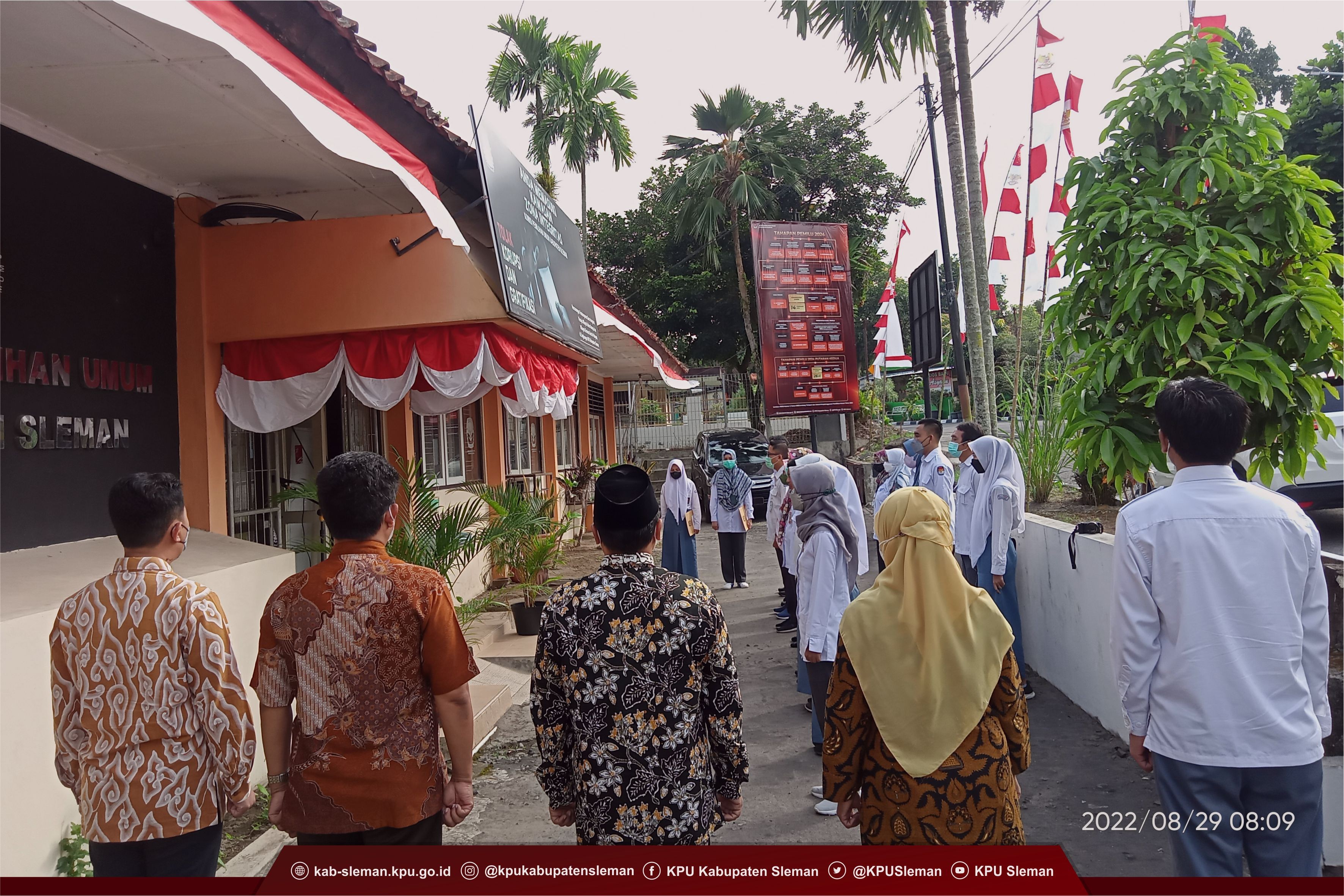 Sleman (29/08) - KPU Kabupaten Sleman kembali menggelar apel rutin. Apel rutin yang dimulai pada pukul 08.00 WIB ini diikuti oleh seluruh Sumber Daya Manusia (SDM) di lingkungan KPU Kabupaten Sleman mulai dari ketua, anggota, sekretaris, pejabat struktural, pelaksana, PPNPN hingga siswa/i PKL SMK Negeri 1 Tempel.