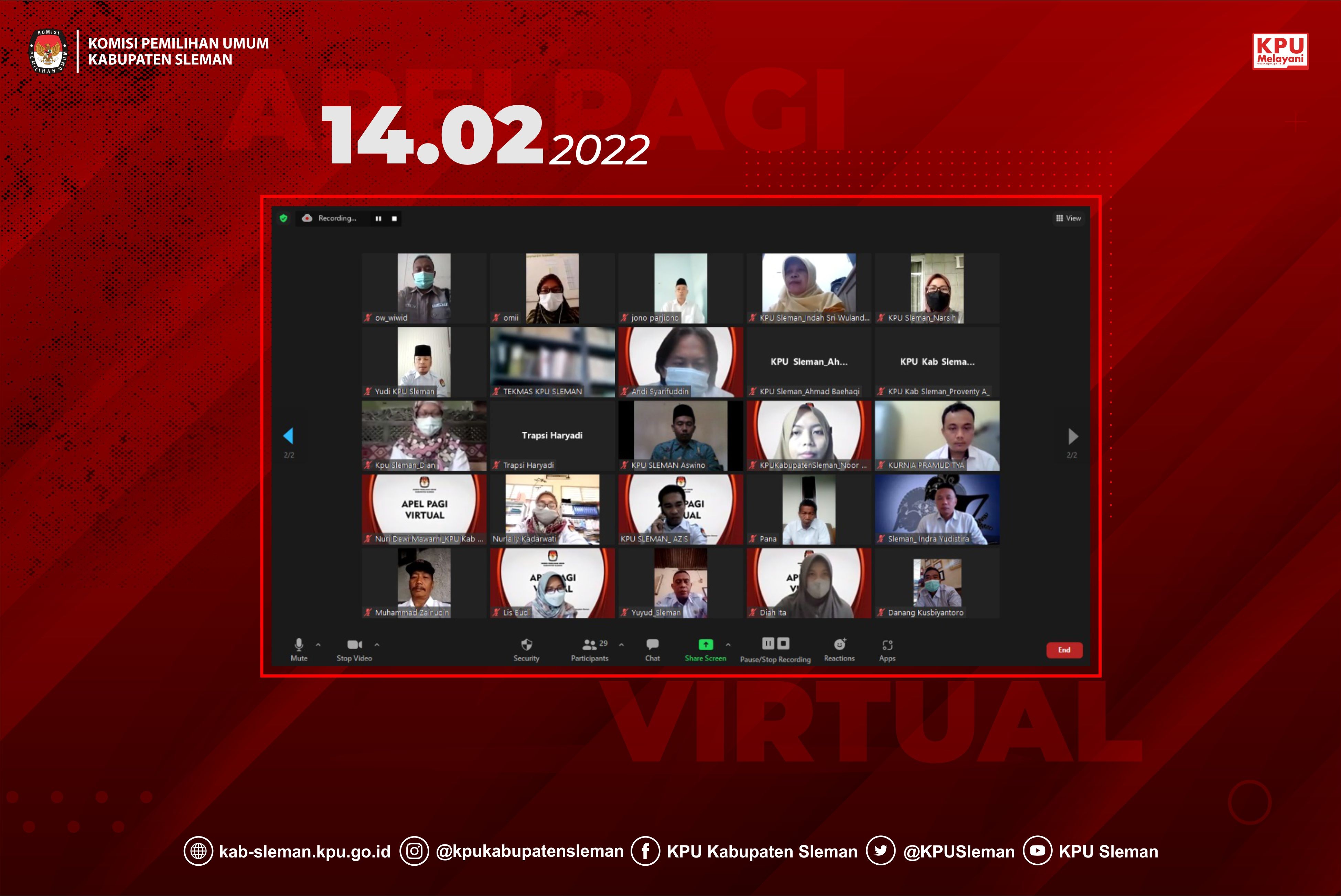 Sleman (15/02) – KPU Kabupaten Sleman kembali melaksanakan apel rutin secara virtual pada Senin 14 Februari 2022. Dalam apel rutin ini, seluruh pegawai di Lingkungan KPU Kabupaten Sleman hadir secara daring melalui pranala Zoom Cloud Meeting.