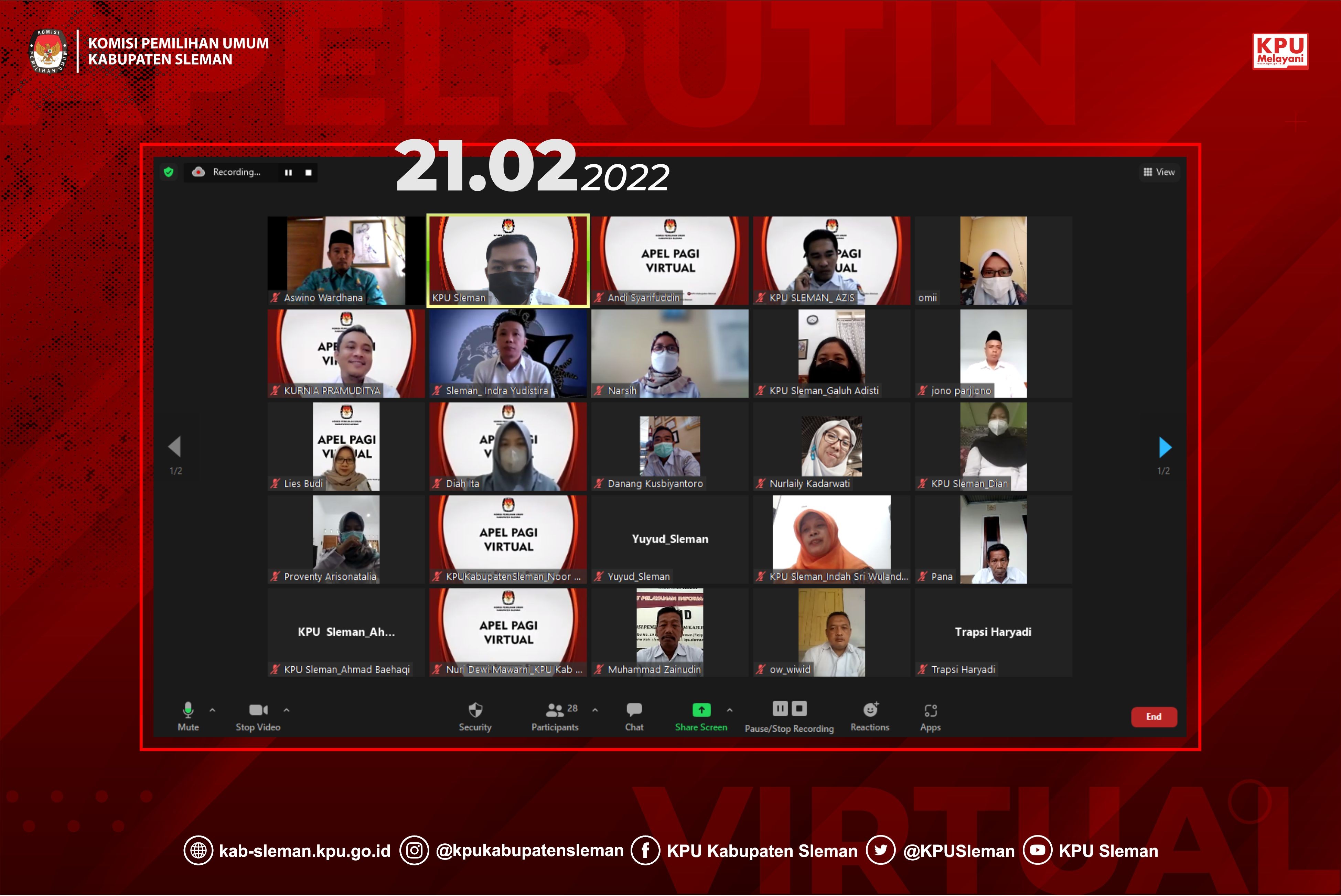 Sleman (21/02) – KPU Kabupaten Sleman kembali menggelar apel rutin pada Senin (21/02) secara virtual. Seluruh SDM dilingkungan KPU Kabupaten Sleman hadir secara daring melalui pranala Zoom Cloud Meeting.