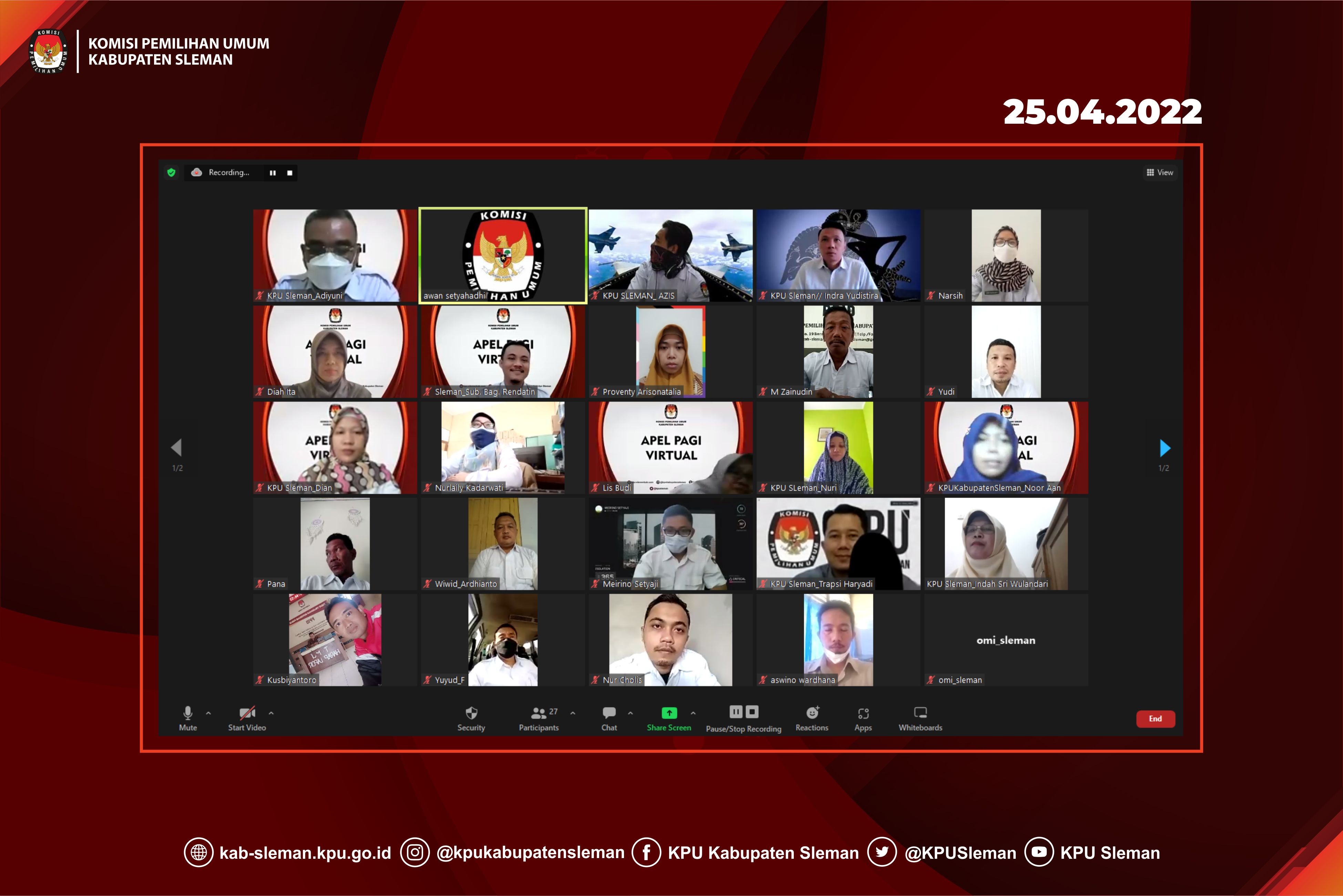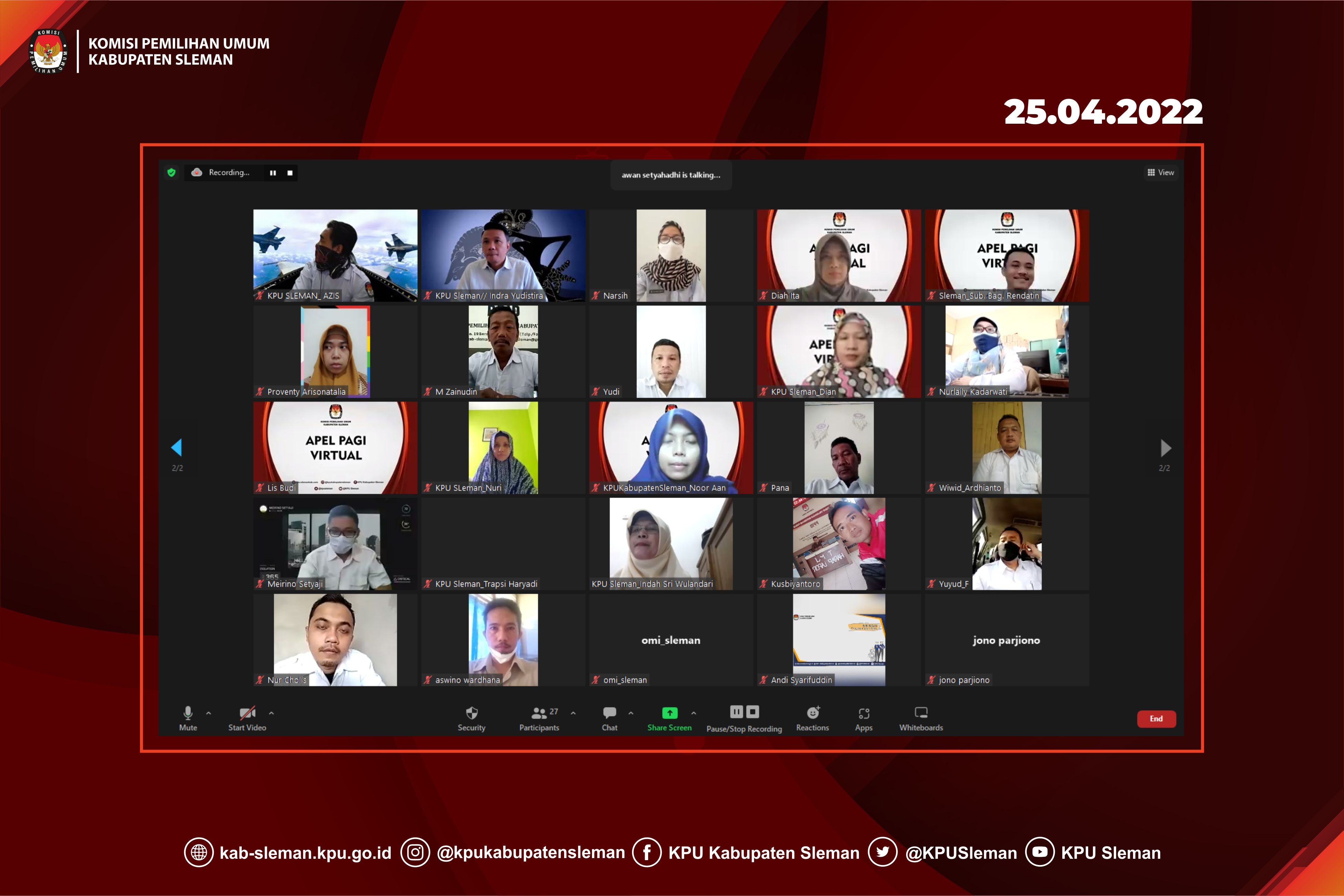 Sleman (25/04) – Apel rutin mingguan kembali digelar KPU Kabupaten Sleman secara virtual. Apel ini menjadi yang terakhir sebelum libur dan cuti lebaran Idul Fitri 1443 H. SDM KPU Kabupaten Sleman hadir secara daring melalui pranala Zoom Cloud Meeting pada pukul 08.00 WIB.