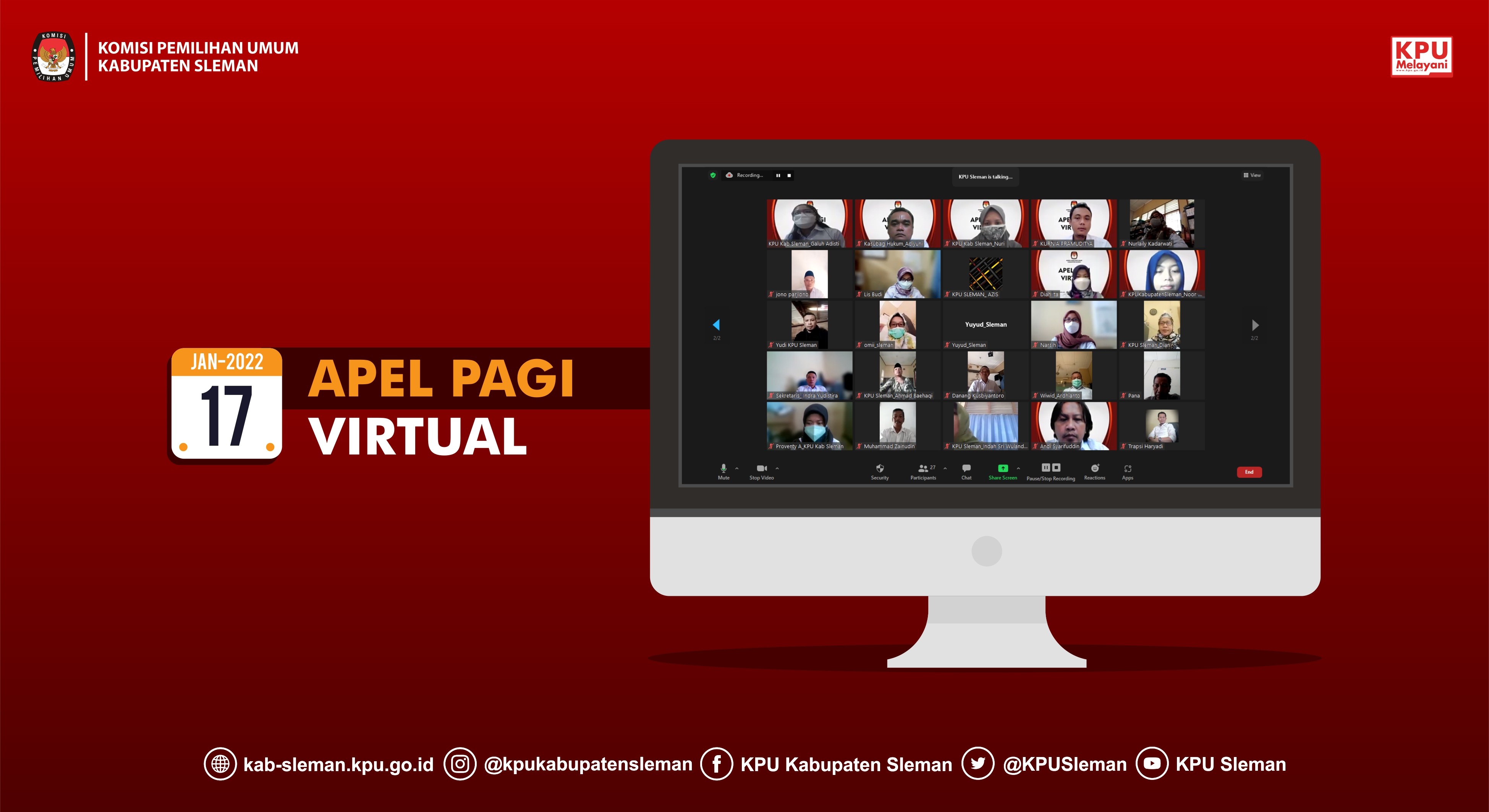 Sleman (17/01) – KPU Kabupaten Sleman kembali melaksanakan apel rutin secara virtual Senin (17/01). Dalam apel rutin ini seluruh pegawai di Lingkungan KPU Kabupaten Sleman hadir secara daring melalui pranala Zoom Cloud Meeting.