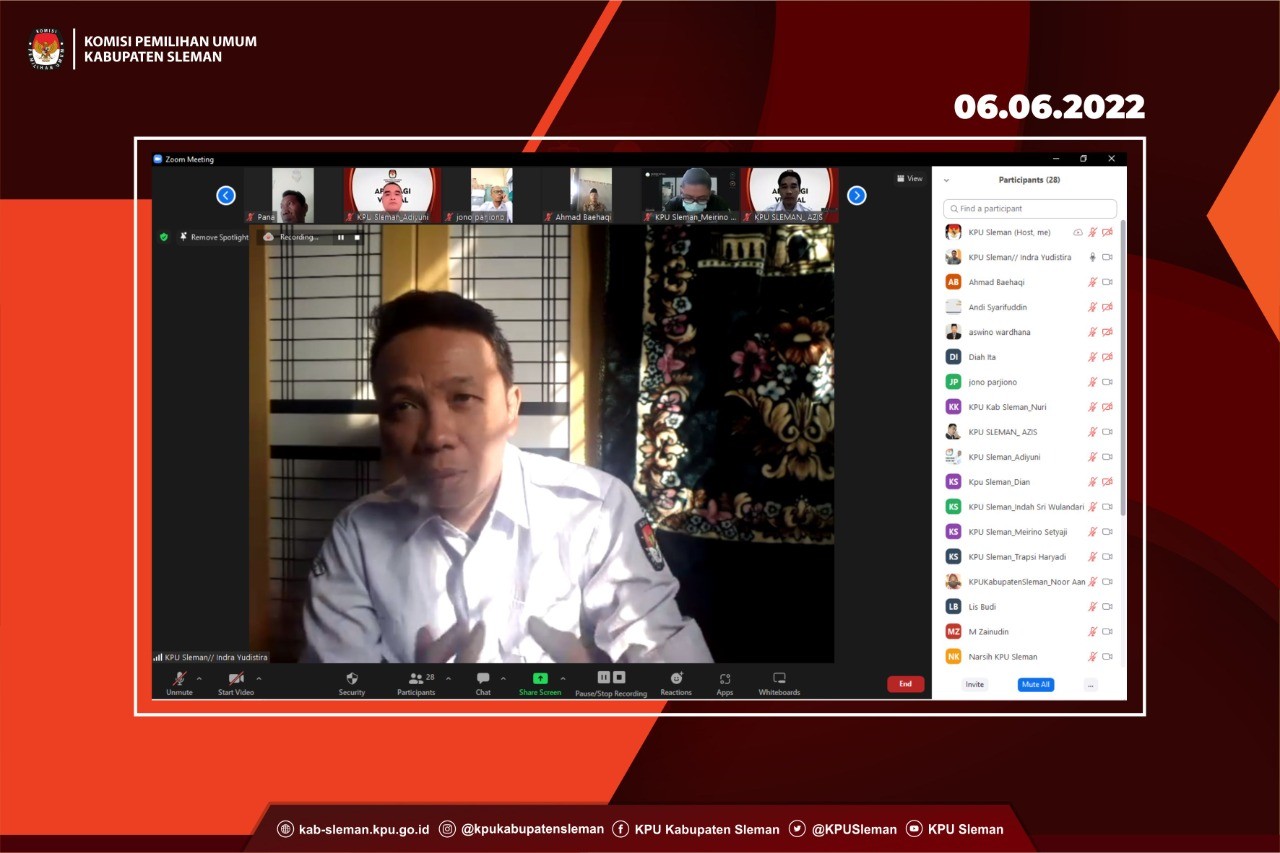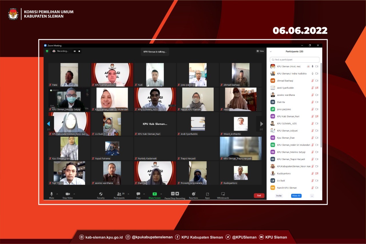 Sleman (06/06) – Apel rutin mingguan kembali digelar KPU Kabupaten Sleman secara virtual. Apel ini menjadi yang pertama di Bulan Juni 2022. Kegiatan ini masih dilaksanakan secara daring melalui pranala Zoom Cloud Meeting pada pukul 08.00 WIB dengan tema benturan kepentingan bagi penyelenggara pemilu.