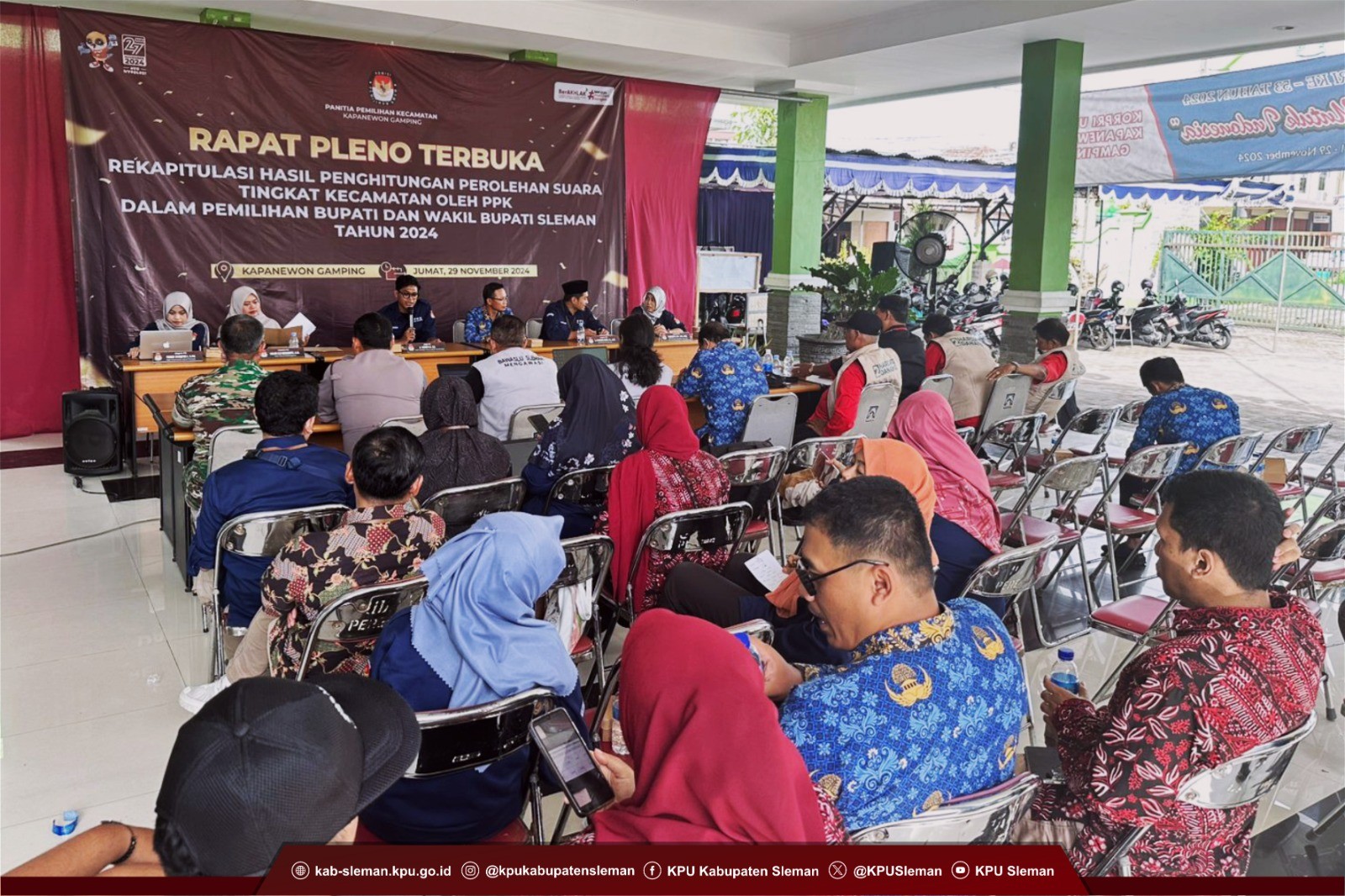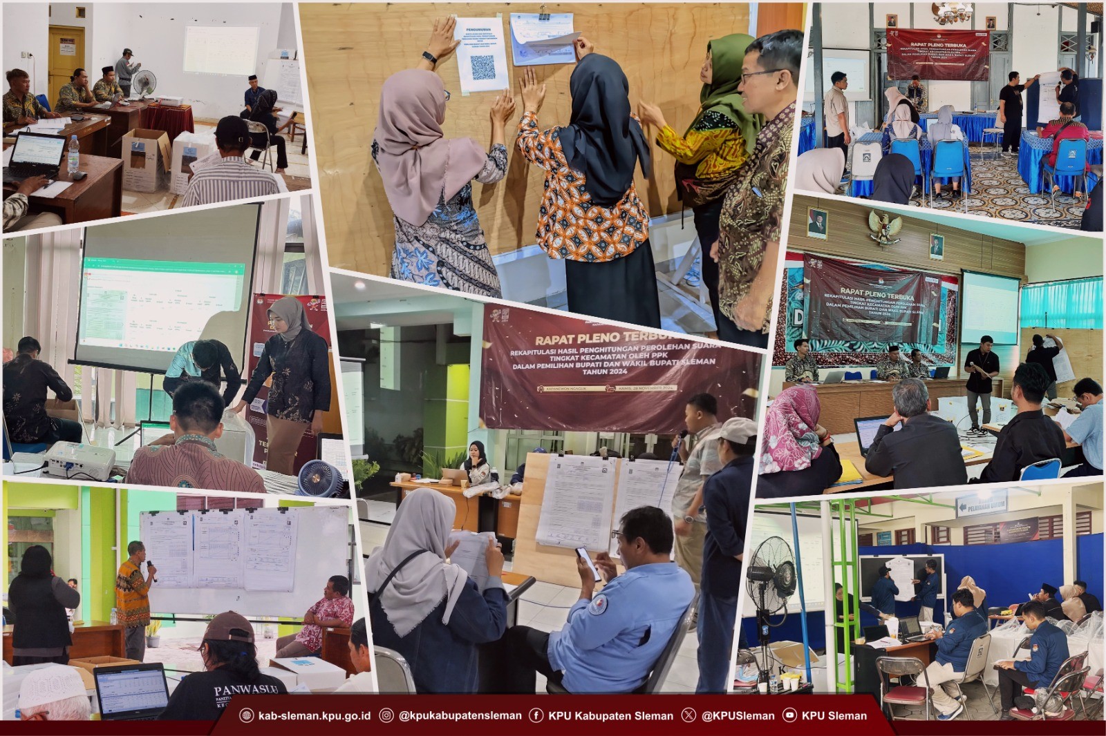 Sleman (30/11) - setelah pelaksanaan pemungutan dan penghitungan suara di TPS selesai, PPK se-Kabupaten Sleman melaksanakan rapat pleno terbuka rekapitulasi hasil penghitungan perolehan suara tingkat kecamatan pada Pemilihan Bupati dan Wakil Bupati Sleman Tahun 2024. Rapat pleno rekapitulasi oleh PPK dilaksanakan secara serentak di seluruh kapanewon se-Kabupaten Sleman pada tanggal 28 November 2024.