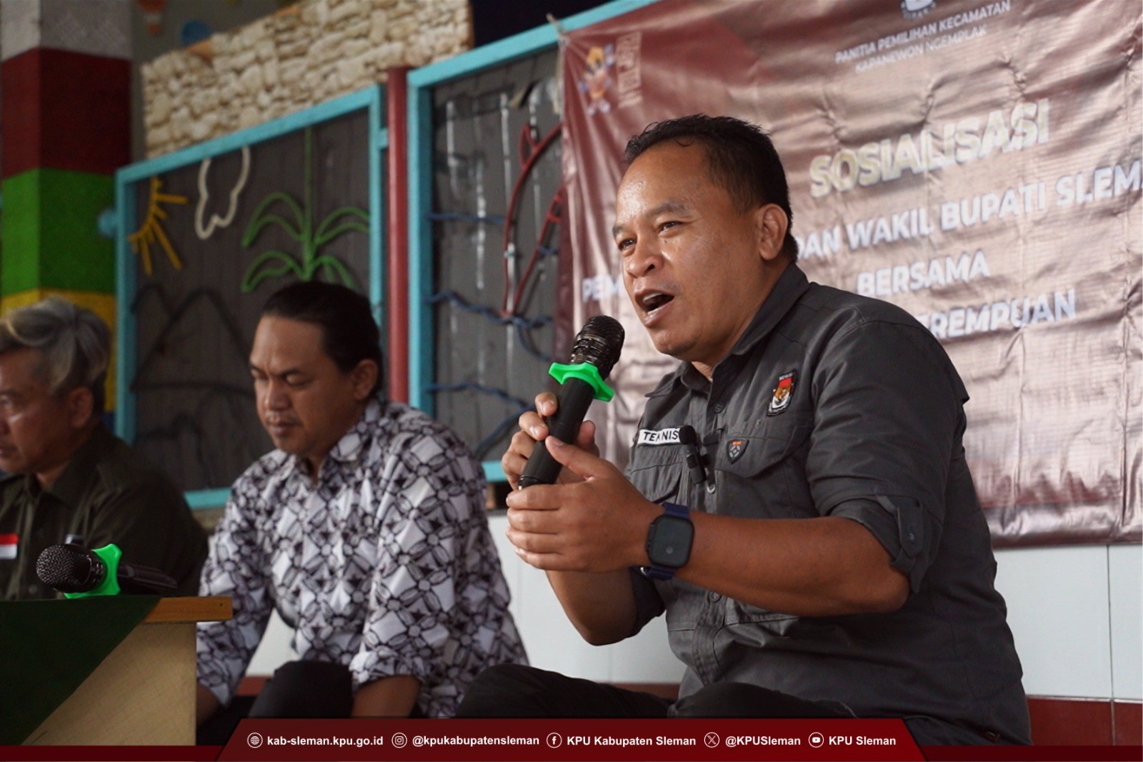 Bekti Gunawan selaku Ketua PPK Kapanewon Ngemplak mengawali sosialisasi dengan mengajak peserta menggunakan hak pilihnya di TPS pada Rabu, 27 November 2024 dan memperkenalkan pasangan calon dalam Pilkada Sileman Tahun 2024, yaitu Nomor Urut 1 Kustini Sri Purnomo – Sukamto dan Nomor Urut 2 Harda Kiswaya – Danang Maharsa. Gunawan dalam pemaparan materinya juga memberikan pendidikan politik dengan mengajak peserta agar dapat memilih sesuai hati nurani dengan mempertimbangkan visi, misi, dan programnya masing-masing yang sekiranya terbaik karena setiap suara sangat berharga dalam menentukan pemimpin ke depan, sehingga harapannya tidak ada yang golput.
