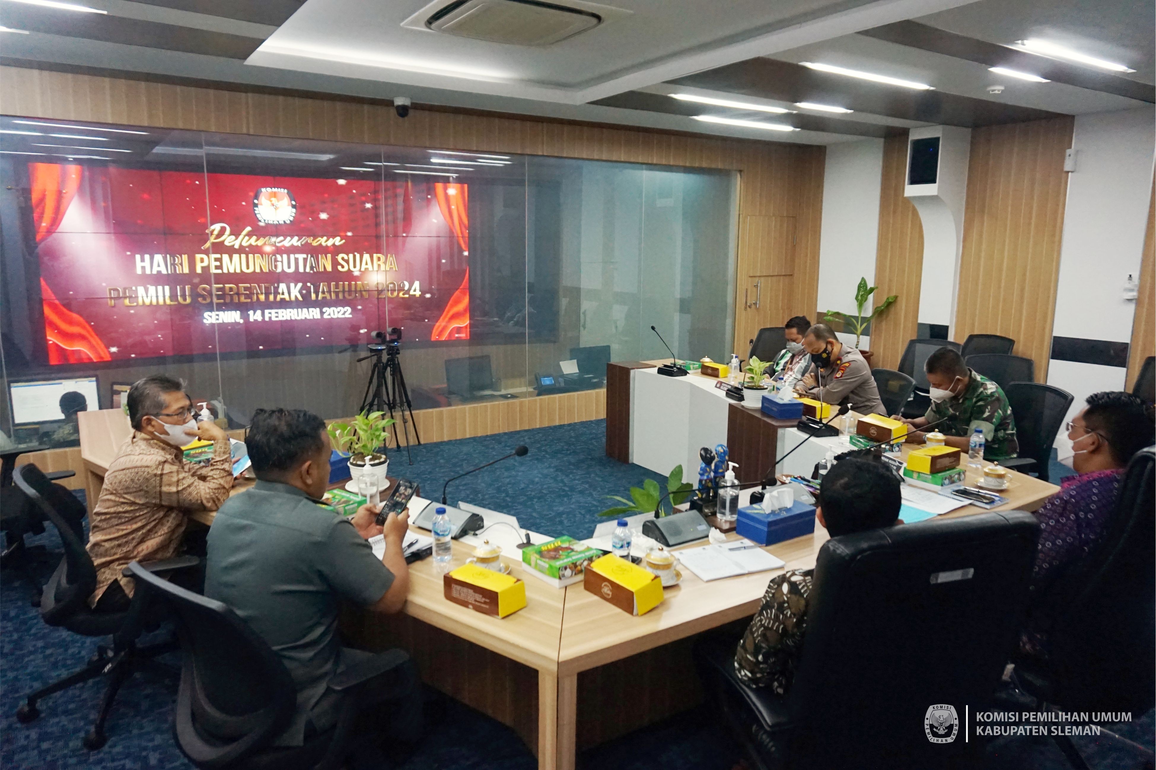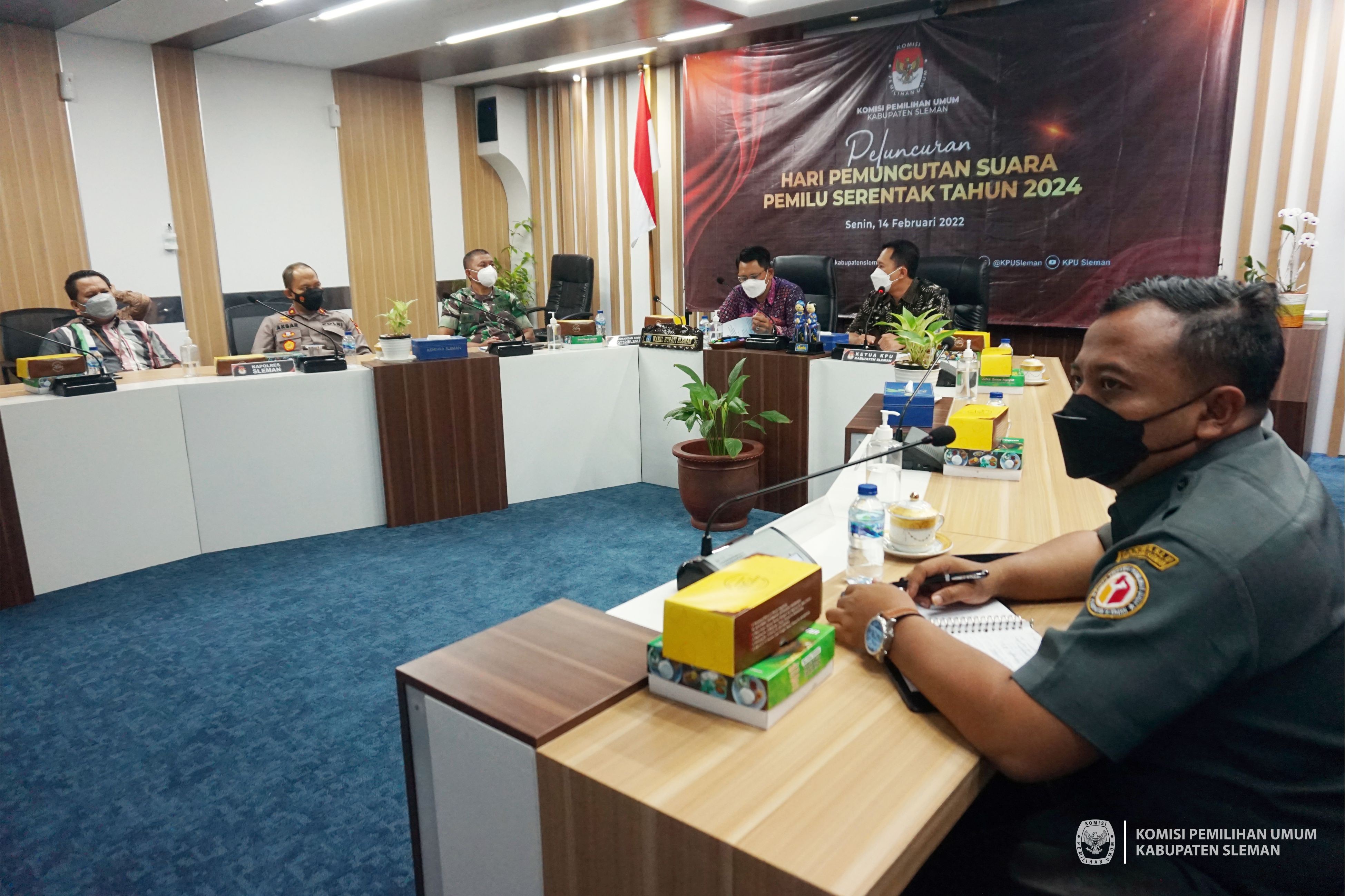 Sleman (16/02) – KPU RI telah menetapkan Keputusan KPU Nomor 21 Tahun 2022 tentang Hari dan Tanggal Pemungutan Suara Pemilu Serentak Tahun 2024. Keputusan ini ditindaklanjuti dengan menyelenggarakan Peluncuran Hari Pemungutan Suara Pemilu Serentak Tahun 2024 oleh KPU RI. Seluruh jajaran penyelenggara pemilu baik KPU/KIP Provinsi juga KPU Kabupaten/Kota turut serta menggelar acara serupa di wilayahnya masing-masing. KPU Kabupaten Sleman menggelar Peluncuran Hari Pemungutan Suara Pemilu Serentak Tahun 2024 di Smart Room Dinas Komunikasi dan Informatika Kabupaten Sleman. Acara yang dimulai pada pukul 18.30 WIB ini digelar dengan menerapkan protokol pencegahan COVID-19 yang ketat.