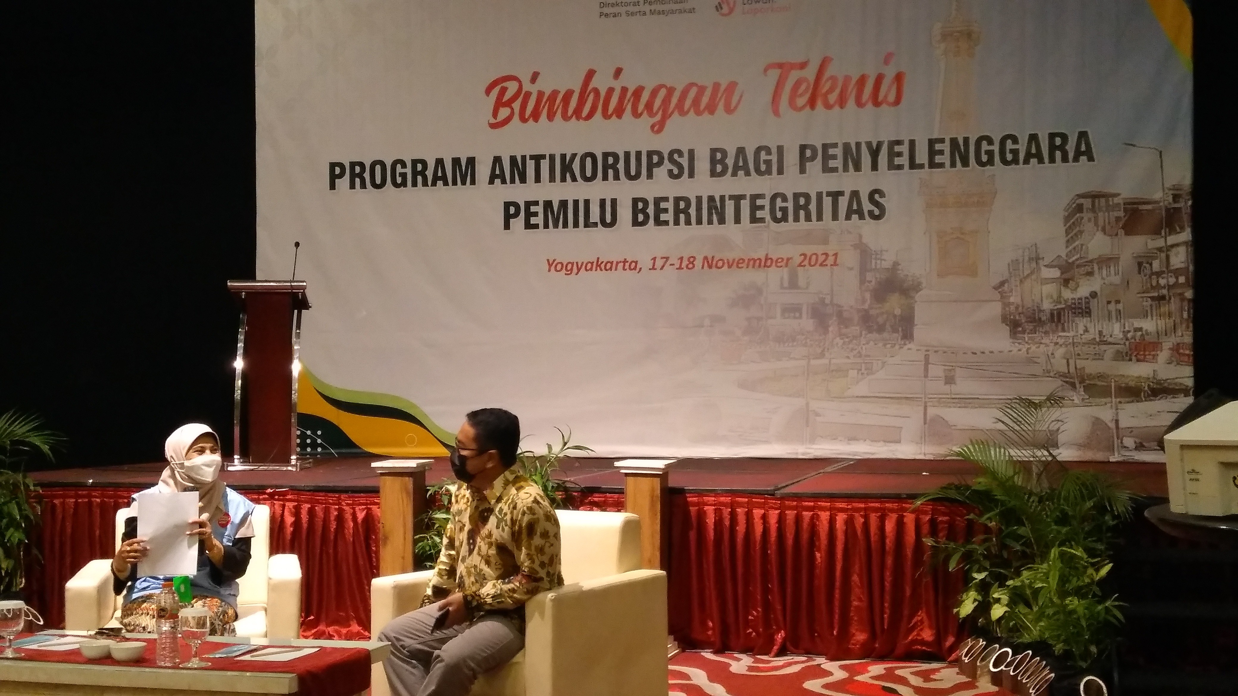 Sementara Dr. rer pol Mada Sukmajati, S.IP., M.P.P. yang menjabat sebagai Ketua Program Studi Sarjana Politik dan Pemerintahan Fisipol UGM, secara khusus menyampaikan materi terkait konflik kepentingan dan gratifikasi dalam penyelenggaraan Pemilu. Index Pemilu yang berintegritas Indonesia Tahun 2018 berada pada angka 54 dari 100. Data ini merefleksikan bahwa Pemilu di Indonesia berada ditengah-tengah dan belum sepenuhnya berintegritas. Mada menganalogikan bahwa integritas dan kompetensi sebagai dua sisi dari koin. Konflik kepentingan terjadi karena ada subyek (pelaku), ada wewenang yang dimiliki serta ada tindakan yang dilakukan. Dalam pemaparan materi, Mada mengajak peserta untuk mengidentifikasi konflik kepentingan yang pernah dialami setiap orang dalam organisasi/instansinya.