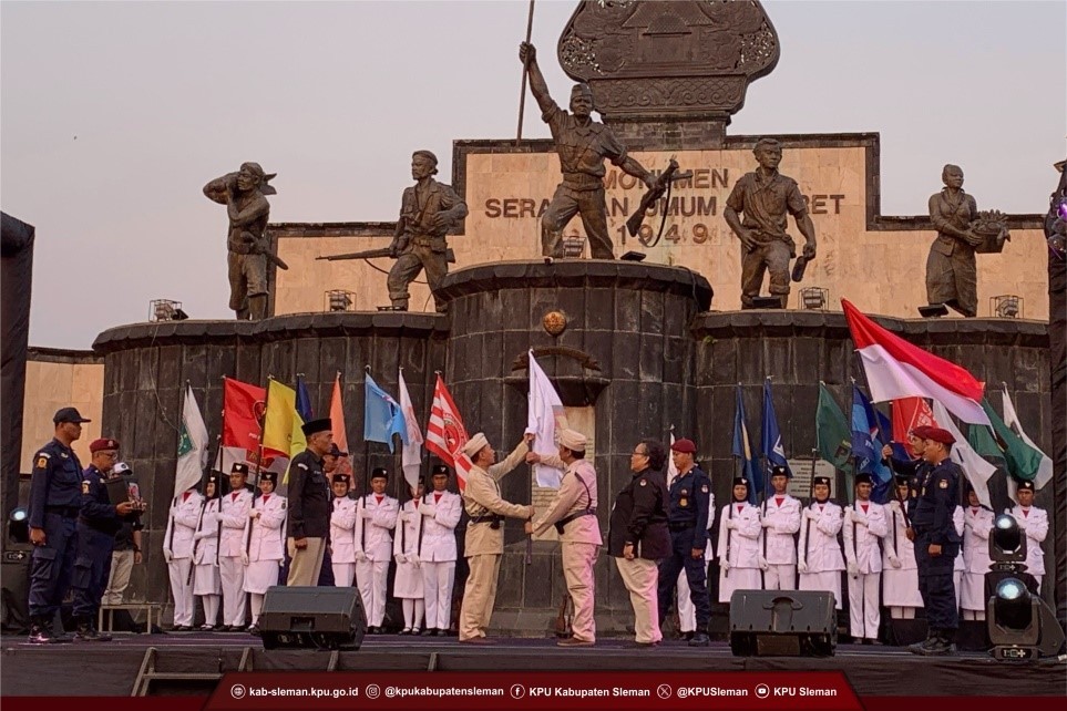 Sleman (18/10) - Sebagai penghujung kegiatan Sosialisasi dan Pendidikan Pemilih dalam acara Kirab Pemilu 2024 di Kabupaten Sleman, KPU Kabupaten Sleman telah melakukan penyerahan bendera Merah Putih, bendera Pataka KPU dan Kotak Hitam kepada KPU Kota Yogyakarta pada Rabu (18/10). Seremoni penyerahan Kirab Pemilu 2024 tersebut bertempat di Monumen Serangan Umum Satu Maret 1949. Dalam prosesi penuh khidmat tersebut, turut hadir Ketua dan Anggota KPU DIY, Ketua dan Anggota KPU Kabupaten Sleman, Ketua dan Anggota KPU Kota Yogyakarta, dan Sekretariat KPU Kota Yogyakarta serta Badan Adhoc se-Kota Yogyakarta.