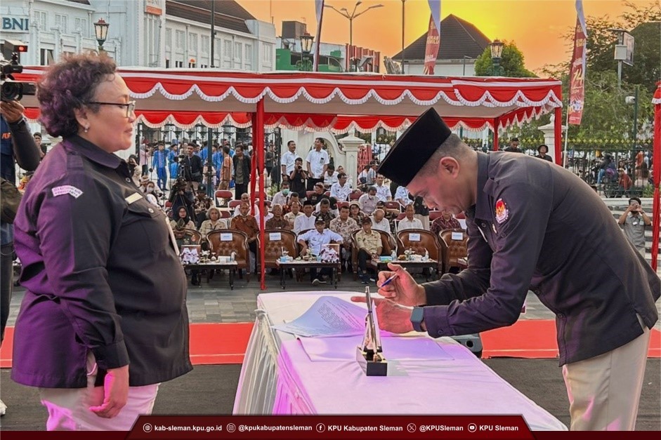 Kegiatan Serah Terima Kirab Pemilu 2024 dari KPU Kabupaten Sleman kepada KPU Kota Yogyakarta resmi diserahkan setelah penandatanganan Berita Acara Serah Terima Bendera Kirab Pemilu Tahun 2024 oleh Sekretaris KPU Kabupaten Sleman dan Sekretaris KPU Kota Yogyakarta, dengan diketahui oleh Sekretaris KPU DIY. (Win)