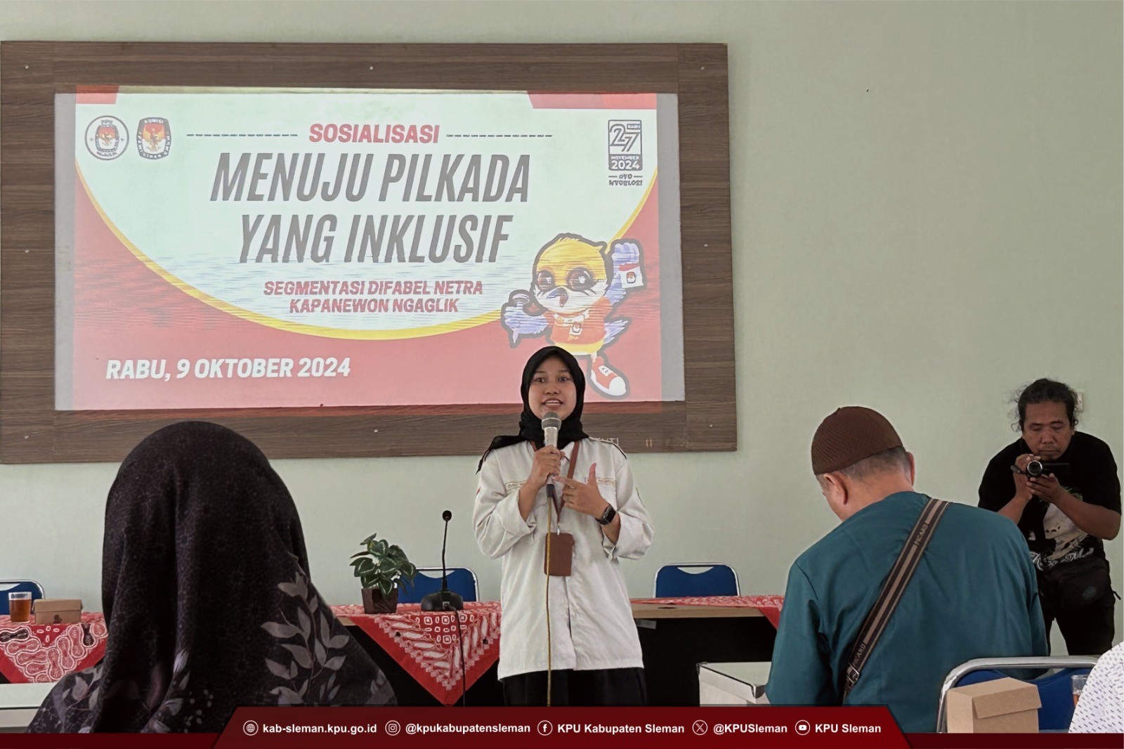 "Berdasarkan Daftar Pemilih Tetap (DPT), terdapat 49 pemilih disabilitas netra di Kapanewon Ngaglik dan puji syukur hari ini kita berkesempatan untuk belajar bersama melakukan sosialisasi dan simulasi sebagai salah satu upaya bersama untuk menjangkau Pilkada Sleman 2024 yang aksesibel dan inklusif," ucap Dita Hendri, Ketua PPK Ngaglik.