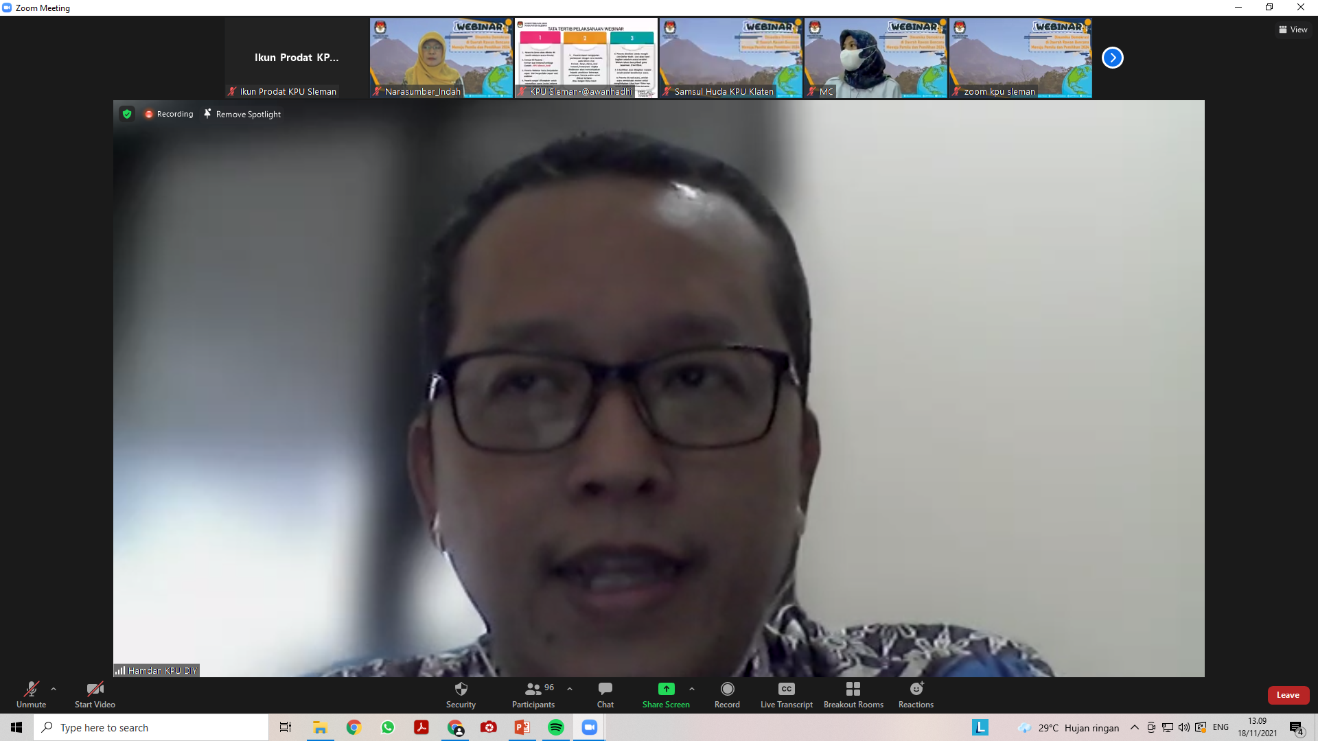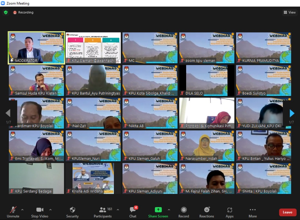 Bertindak selaku moderator dalam webinar ini Sekretaris KPU Kabupaten Sleman, Indra Yudistira. Tiga narasumber dari tiap kabupaten diantaranya Indah Sri Wulandari (KPU Kabupaten Sleman), Pardiman (KPU Kabupaten Boyolali) serta Samsul Huda (KPU Kabupaten Klaten). Dalam paparannya, Indah menekankan tentang bagaimana Pemutakhiran Data Pemilih di daerah rawan bencana. Sementara Samsul, menyampaikan paparannya terkait dengan Dinamika Teknis Kepemiluan di daerah rawan bencana. Pardiman menyampaikan bagaimana upaya peningkatan partisipasi pemilih di daerah rawan bencana.