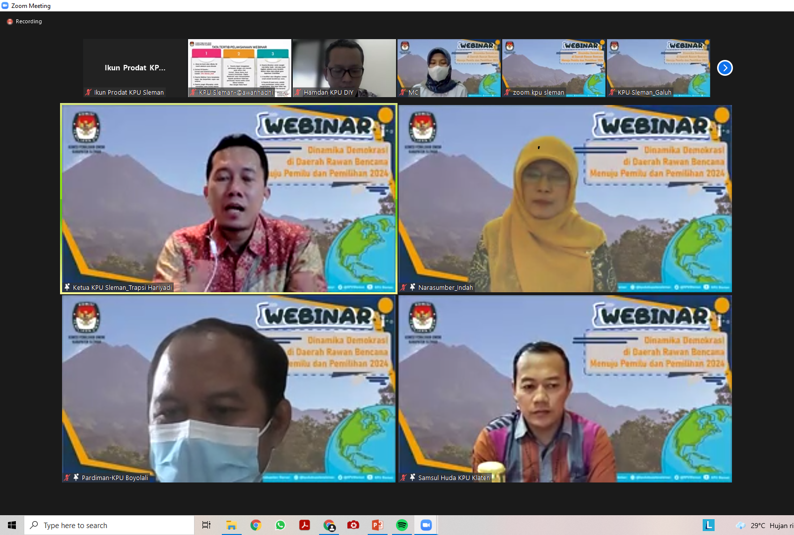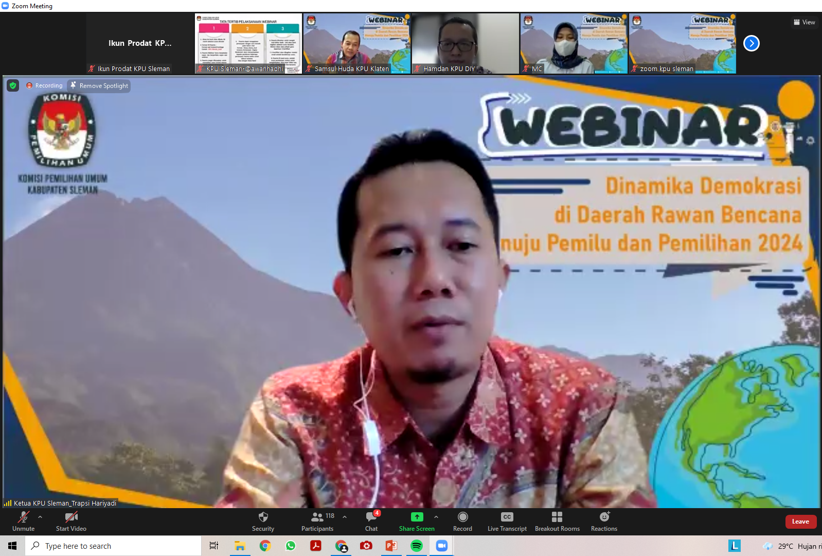 Karakteristik keteraturan dan kepastian yang dituntut dalam penyelenggaraan Pemilu dan Pemilihan bertolak belakang dengan karakteristik bencana yang penuh ketidakpastian dan berpotensi mengacaukan. Guna mempersiapkan pelaksanaan Pemilu dan Pemilihan tahun 2024 yang tanggap bencana, KPU Kabupaten Sleman menggelar kegiatan Webinar bertema " Dinamika Demokrasi di Daerah Rawan Bencana menuju Pemilu dan Pemilihan 2024" pada Kamis (18/11) lalu. Dalam webinar ini, KPU Kabupaten Sleman menggandeng dua kabupaten yang secara geografis juga berada dalam daerah rawan bencana Gunung Merapi yaitu KPU Kabupaten Boyolali dan KPU Kabupaten Klaten.