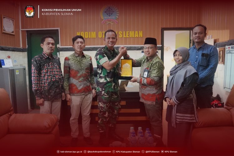 Sleman – Dalam rangka memperkuat koordinasi antarlembaga, KPU Kabupaten Sleman melaksanakan audiensi ke Kodim/0732 Sleman pada Senin (05/05). Audiensi tersebut juga dilakukan sebagai perkenalan karena terdapat pergantian Komandan Kodim (Dandim) dari Letkol Inf. Muhammad Zainulloh, Int, M.M. kepada Letkol Inf. Yusuf Prasetyo, S.Sos, M.M. Ahmad Baehaqi selaku Ketua KPU Kabupaten Sleman dalam kunjungannya mengawali audiensi dengan memperkenalkan diri dan juga seluruh anggota KPU Kabupaten Sleman kepada Dandim/0732 Sleman yang baru yaitu Letkol Inf. Yusuf Prasetyo, S.Sos, M.M. Selain itu, Baehaqi menyampaikan bahwa pelaksanaan Pemilihan Bupati dan Wakil Bupati Sleman Tahun 2024 yang telah usai beberapa waktu lalu telah berjalan dengan aman, lancar, dan damai. Hal tersebut didukung dan di-support penuh oleh Kodim/0732 Sleman. Dalam kesempatan tersebut, Baehaqi juga tetap berharap Kodim/0732 Sleman tetap mendukung pelaksanaan Pemilu 2029 nanti yang jika tidak ada perubahan Undang-Undang Pemilu maka awal tahapan akan dimulai pada pertengahan tahun 2027. Gayung bersambut, Letkol Inf. Yusuf Prasetyo, S.Sos, M.M. menyampaikan bahwa meski tahapan masih jauh, Kodim/0732 Sleman tentunya selain berkomitmen dalam menjalankan tupoksi dalam kemiliteran juga sebagai pelayan masyarakat untuk tetap berperan dalam menjaga keamanan di wilayahnya, termasuk dukungan pengamanan pemilu dan pemilihan di mana hal tersebut merupakan program pemerintah yang wajib didukung sepenuhnya. Di penghujung akhir acara dilakukan sesi foto bersama sekaligus penyerahan plakat tanda terima kasih kepada kepada Kodim/0732 Sleman atas dukungan yang maksimal sehingga pelaksanaan Pemilihan Bupati dan Wakil Bupati Tahun 2024 terselenggara dengan baik. (cls)