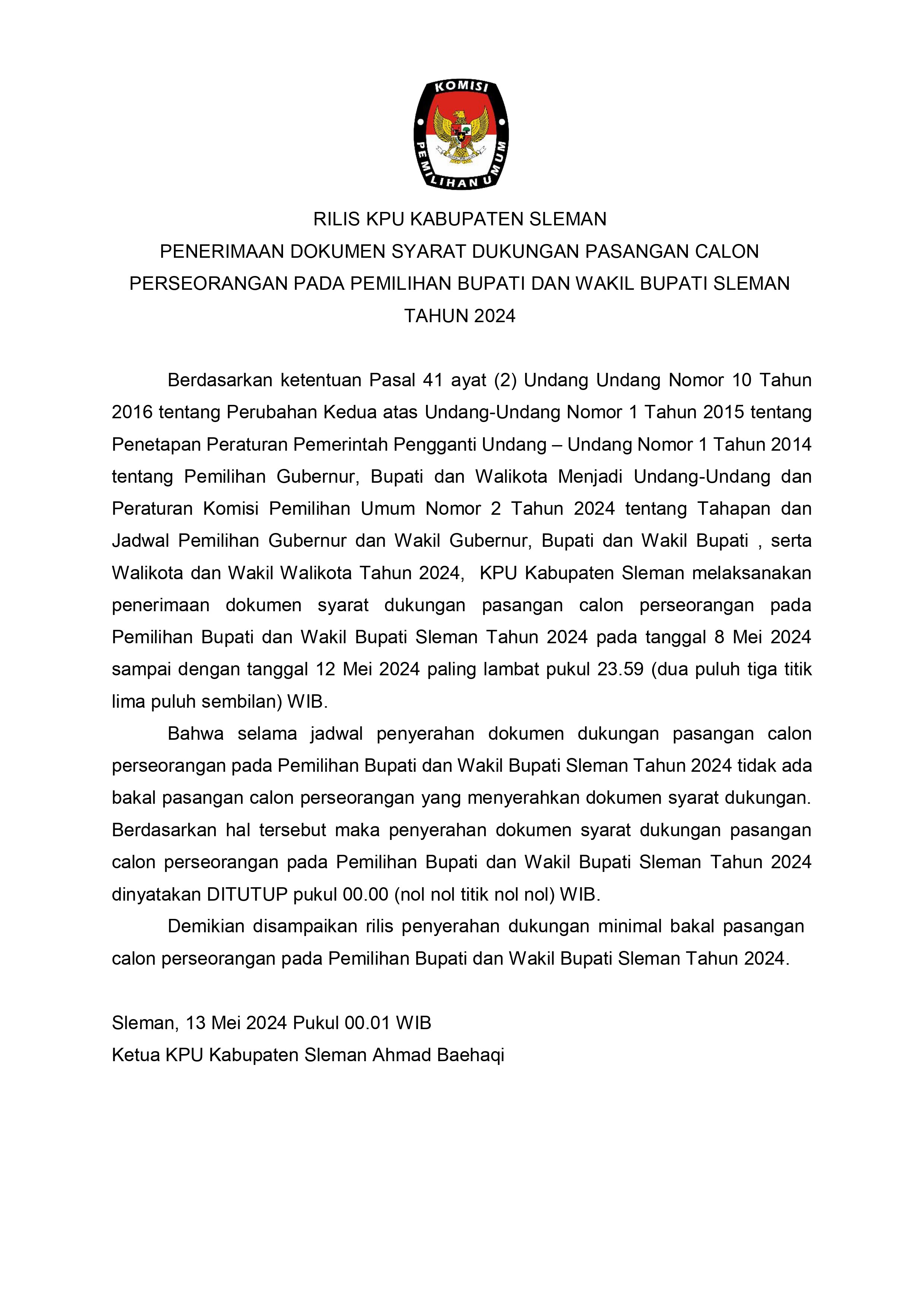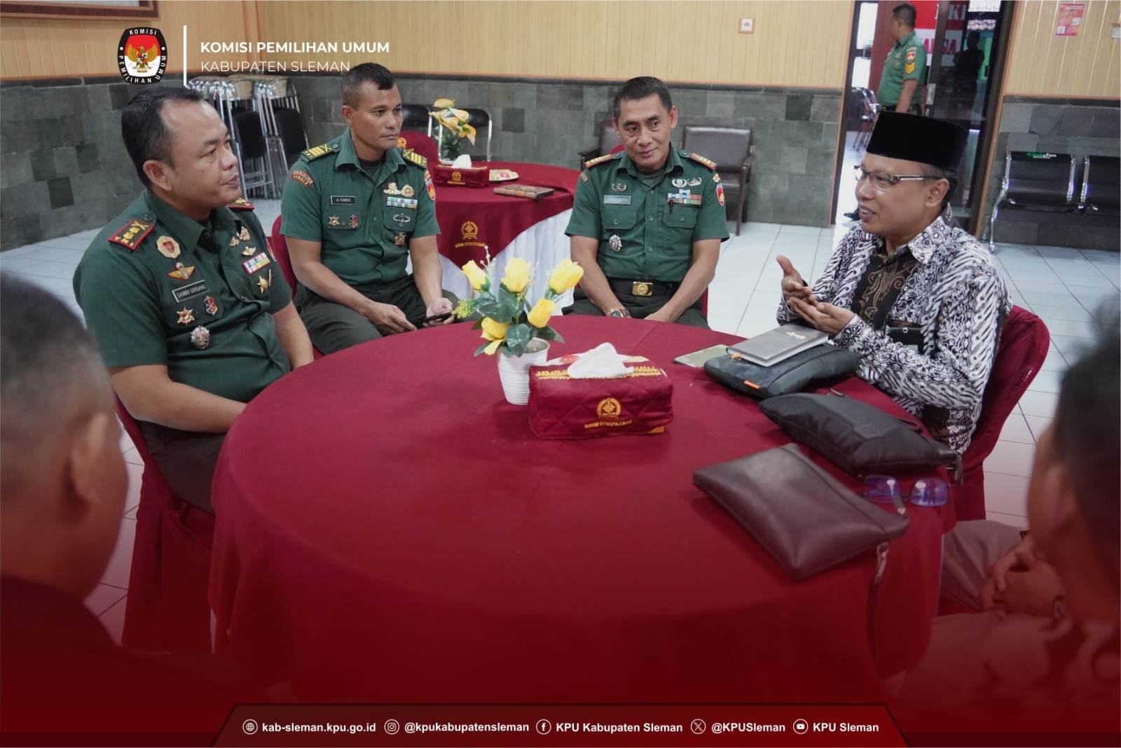 Sleman (06/06) – Dalam rangka memperkuat koordinasi antarlembaga dalam pelaksanaan Pemilihan Bupati dan Wakil Bupati Sleman Tahun 2024, KPU Kabupaten Sleman melaksanakan audiensi ke Kodim/0732 Sleman pada Rabu (05/06). dok.foto Ketua KPU Sleman Ahmad Baehaqi saat sampaikan maksud audiensi Ahmad Baehaqi selaku Ketua KPU Kabupaten Sleman dalam kunjungannya menyampaikan bahwa Tahapan Pemilu Tahun 2024 yang telah dilaksanakan beberapa waktu lalu berjalan dengan lancar dan kondusivitas terjaga dengan baik berkat peran penting TNI/Polri. Dalam kesempatan tersebut, Baehaqi juga menyampaikan bahwa saat ini sedang berlangsung tahapan pemetaan TPS dan dalam waktu dekat akan dilaksanakan peluncuran Pemilihan Bupati dan Wakil Bupati Sleman Tahun 2024. KPU Kabupaten Sleman tentunya masih membutuhkan dukungan pengamanan TNI/Polri dalam setiap tahapan pemilihan khususnya pada saat debat publik di tahapan kampanye, tahapan pengepakan dan distribusi logistik, serta pada saat hari pemungutan suara dan rekapitulasi perolehan suara. dok. foto Komandan Kodim 0732/Sleman Letkol Arm Danny Arianto Pardamean Girsang pastikan TNI akan mendukung pelaksanaan Pilkada Letkol Arm Danny Arianto Pardamean Girsang, S.Sos.,M.Han. selaku Komandan Kodim 0732/Sleman menegaskan bahwa TNI mempunyai tugas pokok keamanan negara. Di antara peran keamanan adalah membantu kesuksesan pelaksanaan pilkada. TNI akan selalu berupaya mengantisipasi hal-hal yang tidak diinginkan dan mendukung pelaksanaan pilkada karena hal tersebut juga akan menjadi citra positif di Kabupaten Sleman. Kodim 0732/Sleman siap mendukung pilkada di Sleman sepenuhnya dengan berkoordinasi dengan 17 koramil di tiap kecamatan dan babinsa di tiap kalurahan yang ada di seluruh wilayah Kabupaten Sleman. dok. foto Pembahasan Pengamanan Pilkada 2024 Lebih lanjut dijelaskan bahwa program TNI adalah upaya preventif karena kondisi keamanan di suatu wilayah adalah tidak sekonyong-konyong terjadi, akan tetapi pasti ada penyebab pada pelaksanaan tahapan sebelumnya. Untuk itu TNI selalu melakukan pembinaan kepada masyarakat sejak pelaksanaan Pemilu Tahun 2024 terlebih saat ini pada pelaksanaan pilkada tentu mempunyai tingkat sensitivitas yang tinggi karena ruang lingkup yang lebih terjangkau dan saling terhubung. Intinya TNI fokus pada upaya pencegahan. dok. foto Penyampaian buku Laporan Pemilu Tahun 2024 kepada Dandim 0732/Sleman Di penghujung audiensi, Ketua KPU Kabupaten Sleman memberikan plakat cinderamata dan Buku Laporan Pemilu 2024 kepada Kodim 0732/Sleman sebagai wujud apresiasi dan terima kasih atas dukungan pengamanan selama penyelenggaraan tahapan Pemilu Tahun 2024. (cls)
