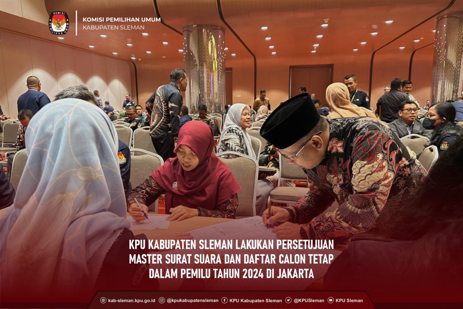 Sleman - KPU Kabupaten Sleman melakukan Persetujuan Master Surat Suara dan Daftar Calon Tetap dalam Pemilu Tahun 2024 yang diselenggarakan oleh KPU di Hotel Grand Mercure, Jakarta pada Selasa (07/11) yang dihadiri oleh Ketua, Anggota Divisi Teknis Penyelenggara Pemilu, dan Admin Silon KPU Kabupaten Sleman. dok. foto Finalisasi Desain Daftar Calon Tetap DPRD Kabupaten Sleman Persetujuan Master Surat Suara dan Daftar Calon Tetap dalam Pemilu Tahun 2024 merupakan rangkaian kegiatan sebelumnya yaitu Rapat Koordinasi Finalisasi Pengisian dan Verifikasi Data Calon Anggota DPR, DPD, DPRD Provinsi, dan DPRD Kabupaten/Kota Pemilu Tahun 2024 dalam Surat Suara dan Perlengkapan Pemungutan Suara Lainnya yang berlangsung di tempat yang sama pada tanggal 30 Oktober s/d 1 November 2023. Mekanisme persetujuan tersebut dilaksanakan melalui proses Finalisasi Desain Surat Suara DPRD Kabupaten Sleman dan Daftar Calon Tetap yang dimulai dari penarikan data hasil submit penyusunan DCT, revisi data hasil finalisasi, approval dari masing-masing pimpinan/petugas penghubung partai politik, hingga sampai pada tahap memastikan hasil dari approval terakhir sudah sesuai dengan penarikan data hasil submit penetapan DCT yang telah ditetapkan pada 3 November 2023. dok. foto Ketua dan Anggota KPU Kab. Sleman serta Operator tunjukkan DCT DPRD Kab. Sleman 2024 Sesuai perencanaan dan tahapan yang telah ditetapkan, desain surat suara final akan diserahkan ke Biro Logistik KPU yang nantinya akan dicetak pada tanggal 10 November 2023. Dengan adanya mekanisme persetujuan yang telah melewati beberapa proses tersebut, diharapkan KPU berhasil zero mistake dari segi administrasi sehingga tidak mengakibatkan sengketa proses.