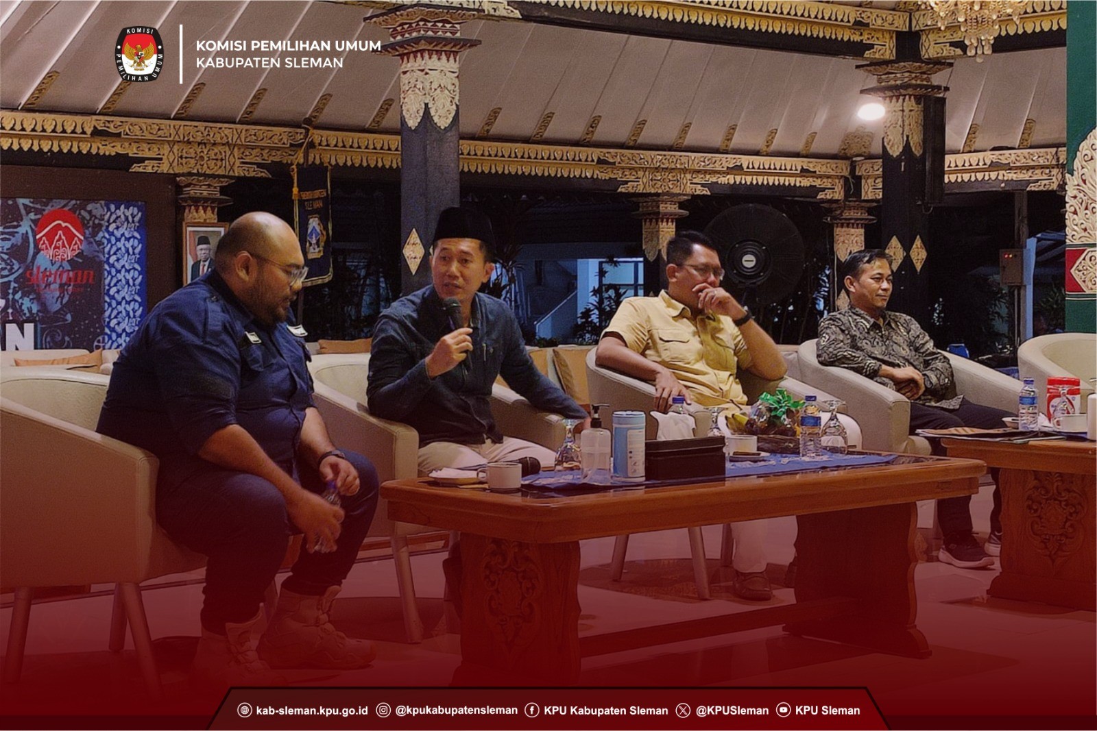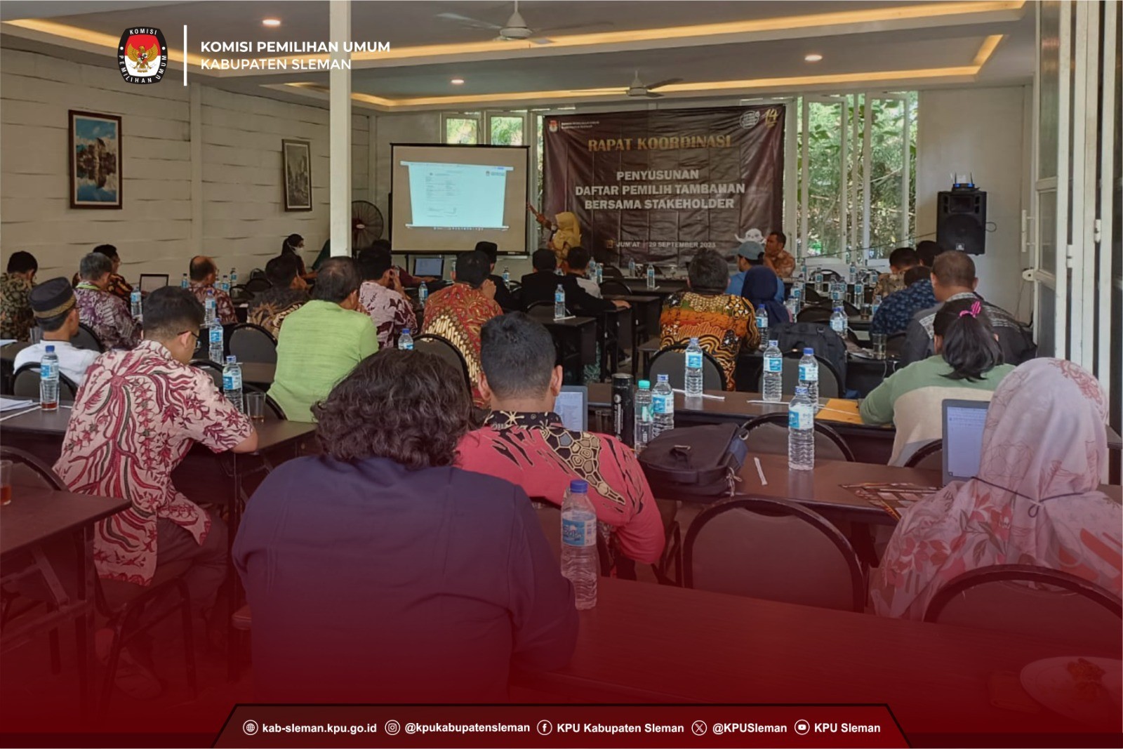 Sleman (02/10) - KPU Kabupaten Sleman kembali menggelar rapat koordinasi dalam rangka penyusunan Daftar Pemilih Tambahan (DPTb) secara luring bertempat di Asram Edupark Jl. Puspita Baru, Jomblang, Sendangadi, Mlati, Sleman, D.I. Yogyakarta pada Jumat (29/09). Rapat koordinasi tersebut mengundang penanggung jawab TPS lokasi khusus, pimpinan perguruan tinggi dan pondok pesantren se-Kabupaten Sleman. dok. foto eserta rapat koordinasi DPtb dari perwakilan TPS lokasi khusus Menilik banyaknya mahasiswa dan santri di perguruan tinggi serta pondok pesantren di Kabupaten Sleman, maka diharapkan pihak-pihak terkait untuk melakukan kerja sama dengan KPU Kabupaten Sleman mengenai penyusunan Daftar Pemilih Tambahan (DPTb). Hal-hal tersebut dilakukan sebagai upaya untuk melindungi hak pilih warga dengan KTP-el luar DIY, yang memenuhi syarat dan ketentuan. dok. foto Kadiv Perdatin saat sampaikan paparan rapat DPtb Terkait kepengurusan pindah pemilih di Kabupaten Sleman, dalam kesempatan ini KPU Kabupaten Sleman memberi himbauan bagi pemilih yang berpotensi menjadi DPTb untuk segera mengurus pindah memilih di PPS, PPK dan KPU Kabupaten/Kota di daerah asal maupun daerah tujuan, agar tidak terjadi antrian panjang atau kerumunan pada saat mendekati batas akhir pengajuan DPTb. Diharapkan setelah rakor ini, dari perwakilan stakeholder bisa menyosialisasikan terkait pengurusan pindah pemilih ini ke lembaga, kampus ataupun pondok pesantren. (Ann)