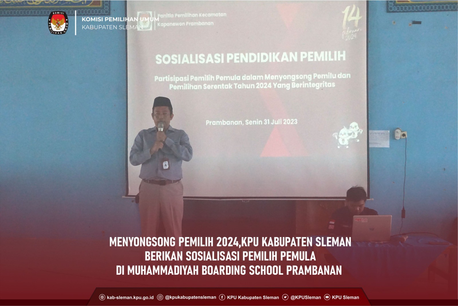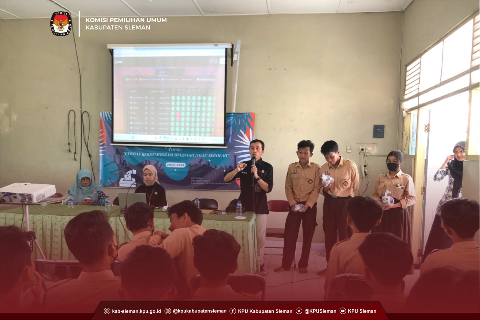 Sleman (14/08) - KPU Kabupaten Sleman diwakili oleh Aswino Wardhana selaku Ketua Divisi Sosialisasi Pendidikan Pemilih, Partisipasi Masyarakat, dan SDM kembali menjadi narasumber untuk paparkan pendidikan pemilih kepada pemilih pemula dalam giat Penerimaan Tamu Ambalan dari Ambalan Sultan Agung-Nyi Ageng Serang bertajuk “Tumbuh dan Kembangkan Tunas Muda Penerus Bangsa yang Berbudi Luhur dalam Misi Gerakan Pramuka Indonesia”. Giat yang dilaksanakan pada Minggu (06/08) pukul 10.00 WIB tersebut bertempat di SMA N 1 Mlati. dok. foto Aswino Wardhana sampaikan materi Tahapan Pemilihan Umum 2024 Sesi materi yang dipaparkan oleh Aswino Wardhana diawali dengan pemaparan pelaksanaan Pemilihan Umum 2024, yakni pada Rabu, 14 Februari 2024 mendatang. Pemilihan Umum 2024 memuat lima jenis pemilihan di dalamnya, yakni Presiden dan Wakil Presiden, DPD RI, DPR RI, DPRD Provinsi, dan DPRD Kabupaten/Kota. Nantinya, para pemilih akan mencoblos surat suara dengan lima jenis pemilihan tersebut. Aswino juga mengajak para peserta kegiatan yang sudah berusia 17 tahun atau memenuhi syarat sebagai pemilih untuk menggunakan hak suaranya pada Pemilu 2024. Namun, sebelum menggunakan hak suaranya, Aswino menekankan untuk memeriksa terlebih dahulu di laman cekdptonline.kpu.go.id untuk memastikan sudah terdaftar sebagai pemilih pada Pemilu 2024. Para pemilih yang belum terdaftar dapat lapor kepada PPS untuk tingkat kalurahan dan PPK untuk tingkat kapanewon. dok. foto bersama siswa SMP N 1 Mlati beserta narasumber Selanjutnya, Aswino juga memaparkan terkait Daftar Pemilih Tetap (DPT) dalam lingkup Kabupaten Sleman yang sudah ditetapkan pada 21 Juni 2023 lalu. KPU Kabupaten Sleman menetapkan 411.352 laki-laki sebagai pemilih dan 437.710 pemilih perempuan, sehingga total pemilih pada wilayah Kabupaten Sleman yakni 849.062 yang tersebar dalam 3457 TPS. (Win)