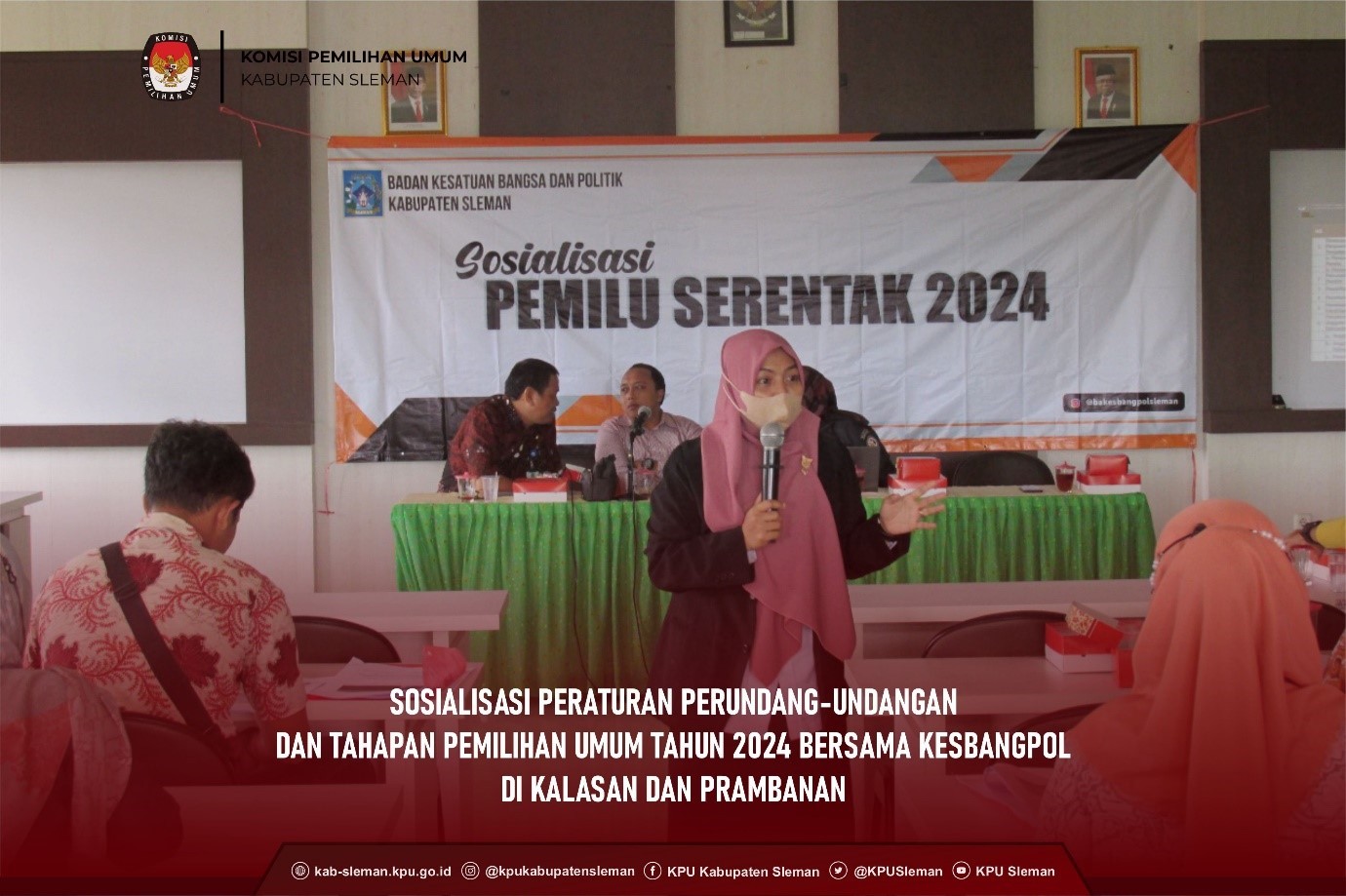 Sleman – Ketua Divisi Teknis Penyelenggaraan KPU Kabupaten Sleman memberikan Sosialisasi Pemilu Serentak Tahun 2024 yang diselenggarakan oleh Badan Kesbangpol Kabupaten Sleman, dengan narasumber dari KPU Kabupaten Sleman, Bawaslu Kabupaten Sleman dan dari akademisi. Acara yang dihadiri oleh Forkopimcam, perangkat desa, pemilih pemula, karang taruna, tokoh masyarakat, dan tim Penggerak PKK yang dilaksanakan pada hari Rabu, 1 Februari 2023. dok.foto Pemilih pemula turut serta ikuti sosialisasi Pemilu Serentak 2024 Dibuka oleh sambutan dari Panewu Kapanewon Ngemplak, dalam sambutannya mengucapkan terima kasih atas kehadiran dari hadirin tamu undangan. Dilanjutkan dengan paparan penanggungjawab kegiatan yaitu Badan Kesbangpol Kabupaten Sleman. Kepala Badan Kesbangpol Kabupaten Sleman, Hery Sutopo menyampaikan, acara sosialisasi Pemilu 2024 merupakan sinergitas antara Pemerintah Kabupaten Sleman, KPU dan Bawaslu. Tujuan diadakan sosialisasi yaitu kewajiban pemerintah daerah beserta penyelenggara Pemilu untuk memberikan informasi dan penjelasan kepada masyarakat tentang peraturan perundangan, tahapan Pemilu serta akan dijelaskan mengenai komunikasi politik, komunikasi sosial di masyarakat menyambut perhelatan akbar tersebut. Ini merupakan wujud dukungan Pemerintah Kabupaten Sleman dalam mensukseskan Pemilu tahun 2024. dok. foto Kadiv Teknis Penyelenggaraan sampaikan materi dihadapan peserta Sesi selanjutnya diisi oleh Ketua Divisi Teknis Penyelenggaraan KPU Kabupaten Sleman, Noor Aan Muhlishoh. Dalam kesempatan tersebut Aan menyampaikan beberapa aturan terkait Pemilu 2024. Terdapat 11 tahapan sesuai Undang-undang No 7 Tahun 2017 yaitu perencanaan program dan anggaran serta penyusunan peraturan pelaksanaan penyelenggaraan pemilu, hingga pengucapan sumpah/janji Presiden dan Wakil Presiden serta anggota DPR, DPD, DPRD Provinsi, dan DPRD Kabupaten/Kota. Disampaikan lebih lanjut bahwa tahapan pemilu sudah dimulai pada pertengahan tahun 2022, dan pemungutan suara akan dilaksanakan tanggal 14 Februari 2024. Tahapan pemilu sudah berjalan, telah ditetapkan 18 partai politik nasional dan 6 partai lokal aceh yang akan berkancah di Pemilu 2024. Pada kesempatan tersebut Aan memperkenalkan seluruh partai politik yang akan melaju pada Pemilu 2024. Seiring dengan pelaksanaan tahapan Pemilu yang kian cepat, diharapkan masyarakat dapat menmperbarui informasi mengenai Pemilu 2024 dengan cara mengakses laman infopemilu.kpu.go.id. selain itu masyarakat juga dapat mengakses laman cekdptonline.kpu.go.id untuk mengetahui apakah sudah terdaftar dalam daftar pemilih untuk Pemilu 2024. Jika didapati belum terdaftar dalam daftar pemilih, masyarakat dapat segera lapor dengan mengisi formulir pada laman http://bit.ly/laporpemilihsleman dan/atau dapat datang langsung ke Kantor KPU Kabupaten Sleman untuk memberikan tanggapan masyarakat. dok.foto Tokoh masyarakat simak jalannya sosialisasi Aan menyampaikan tidak dapat dipungkiri, pada saat ini kegiatan politik uang masih terjadi di masyarakat. Sehingga beliau berpesan untuk selalu menjadi pemilih yang cerdas. Kelangsungan bangsa dan Negara berada di tangan masyarakat sebagai pemilih. “ Jika nanti Ibu – Ibu atau Bapak- Bapak menerima pemberian dari partai atau calon anggota legislatif berupa apapun, dan kebetulan disaksikan oleh anak-anak panjenengan, hal itu akan selalu terpatri pada anak-anak bahwa hal tersebut boleh mereka lakukan juga. Hal ini akan menjadi siklus yang akhirnya tidak dapat terputus” tegas Aan. Pada kesempatan itu Anggota Bawaslu Kabupaten Sleman, Vici Herawati menyampaikan ada 3 ketugasan penting Bawaslu, yaitu pencegahan, pengawasan dan penindakan. Pencegahan dan pengawasan Bawaslu dalam bentuk sosialisasi pengawasan, pengawasan partisipatif, pencegahan netralitas ASN, dan pencegahan politik uang. Disampaikan pula mengenai Indikator Kerawanan Pemilu (IKP) meliputi dimensi penyelenggara Pemilu di Sleman, yakni dimensi hak memilih, dimensi pelaksanaan kampanye, dimensi pelaksanaan pemungutan suara hingga dimensi ajudikasi dan keberatan. Jika masyarakat menemui kecurangan atau kecurigaan terhadap adanya pelanggaran Pemilu, dapat langsung memberi laporan kepada Bawaslu. Hingga akhir acara, bahasan politik uang menjadi topik diskusi yang menarik antara pemateri dengan peserta yang hadir. (Mbl)