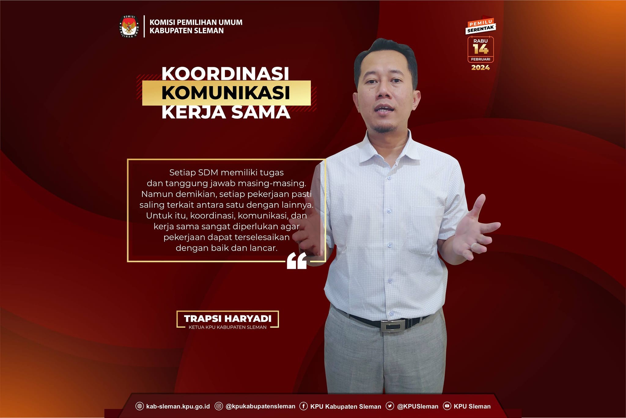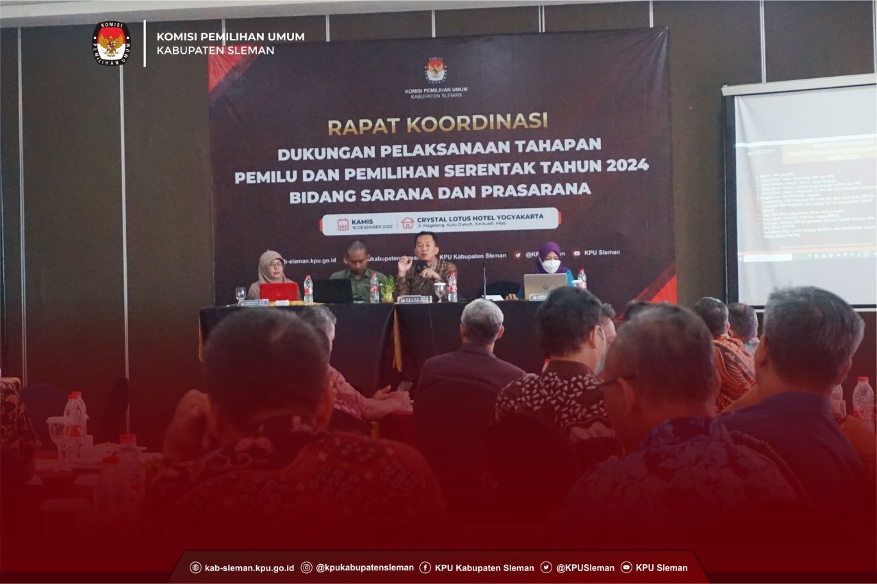 Sleman (15/12) – KPU Kabupaten Sleman menyelenggarakan Rapat Koordinasi Dukungan Pelaksanaan Tahapan Pemilu dan Pemilihan Serentak Tahun 2024 Bidang Sarana Dan Prasarana yang bertempat di Crystal Lotus Hotel Yogyakarta pada Kamis (15/12). Kegiatan tersebut diikuti oleh Polresta Sleman, KODIM 0732/Sleman, instansi terkait Pemerintahan Kabupaten Sleman, Panewu se-Kabupaten Sleman, Paguyuban Lurah Suryo Ndadari, dan Paguyuban Dukuh Cokro Pamungkas. dok. foto Peserta Rapat Koordinasi Dukungan Sarana dan Prasarana Kegiatan diawali dengan pembukaan yang disampaikan oleh Trapsi Haryadi selaku Ketua KPU Kabupaten Sleman yang kemudian dilanjutkan penyampaian sambutan oleh Asisten Satu Bupati Sleman, Aji Wlantara. Dalam penyampaian sambutannya, Pemerintah Kabupaten Sleman berkomitmen untuk mendukung pelaksanaan tahapan demi tahapan pelaksanaan pemilu. Aji menyampaikan harapan bahwa OPD Kabupaten Sleman akan membantu sepenuhnya KPU Kabupaten Sleman sesuai tugas fungsi masing-masing untuk bekerjasama bahu-membahu mensukseskan pemilu. Memasuki acara inti yang dipandu oleh pembicara pertama sekaligus moderator yakni Indah Sri Wulandari selaku Ketua Divisi Perencanaan Data dan Informasi KPU Kabupaten Sleman bersama dua pembicara lain, yaitu Trapsi Haryadi dan Aswino Wardhana. Pada sesi pertama, Indah Sri Wulandari menyampaikan materi mengenai kebutuhan dukungan dalam tahapan Pemilu dan Pemilihan Serentak Tahun 2024. Pada sesi tersebut, Indah Sri Wulandari menyampaikan seluruh tahapan apa saja yang telah dilaksanakan dan tahapan yang akan dilaksanakan berikutnya. Dalam penyampaian materi, Indah Sri Wulandari mengajak kerjasama dengan semua pihak yang terkait dalam keberlangsungan seluruh proses dan tahapan Pemilu Tahun 2024. “Keberhasilan Pemilu 2024 adalah capaian kita bersama. Maka dari itu, semoga kerjasama ini dapat kita lakukan sebaik baiknya.” ujarnya saat penyampaian materi sekaligus menutup materinya. Trapsi Haryadi, selaku Ketua KPU Kabupaten Sleman pada saat pemaparan materi yang kedua menyampaikan mengenai kebutuhan dukungan perkantoran dan pengelolaan logistik Pemilu Tahun 2024. Dalam pemaparannya, Trapsi Haryadi menyampaikan terkait pemenuhan kebutuhan kantor PPK di tingkat kapanewon dan PPS di tingkat kalurahan, serta kebutuhan logistik lainnya yang tentu dalam proses distribusinya memerlukan sumber daya yang cukup banyak, termasuk pentingnya kerja sama dengan OPD terkait. Sebagai contoh adalah kerja sama dengan Dinas Perhubungan Kabupaten Sleman dalam hal pengaturan lalu lintas. dok. foto Tanggapan Peserta terhadap materi yang disampaikan Aswino Wardhana selaku Ketua Divisi Sosialisasi, Pendidikan Pemilih, dan Partisipasi Masyarakat pada saat penyampaian materi ketiga sekaligus terakhir menyampaikan materi mengenai dukungan sarana dan prasarana pada Pemilu 2024. Dalam pemaparannya, beliau menyampaikan bahwa selain menjalin kerjasama dengan OPD terkait di bidang sarana dan prasarana, kerjasama antar masyarakat juga diperlukan dalam penyaluran informasi akan kepemiluan di lingkungan masyarakat. Dalam hal tersebut, Aswino menyampaikan harapan kepada Paguyuban Suryo Ndadari dan Cokro Pamungkas sebagai organisasi yang bersentuhan langsung dengan masyarakat untuk dapat ikut mensosialisasikan tahapan-tahapan Pemilu 2024. dok. foto Photo bersama seluruh peserta Rapat koordinasi Di penghujung acara, Indah Sri Wulandari membuka sesi diskusi. Dalam sesi tersebut, terjalin tanya jawab yang interaktif. Beberapa penyampaian saran serta masukan disampaikan oleh peserta rapat. Indah menyampaikan bahwa saran dan masukan tersebut merupakan sebuah awalan yang baik sebagai bentuk dukungan dari berbagai pihak demi kesuksesan penyelenggaraan Pemilu 2024 di Kabupaten Sleman. (Ayuni)