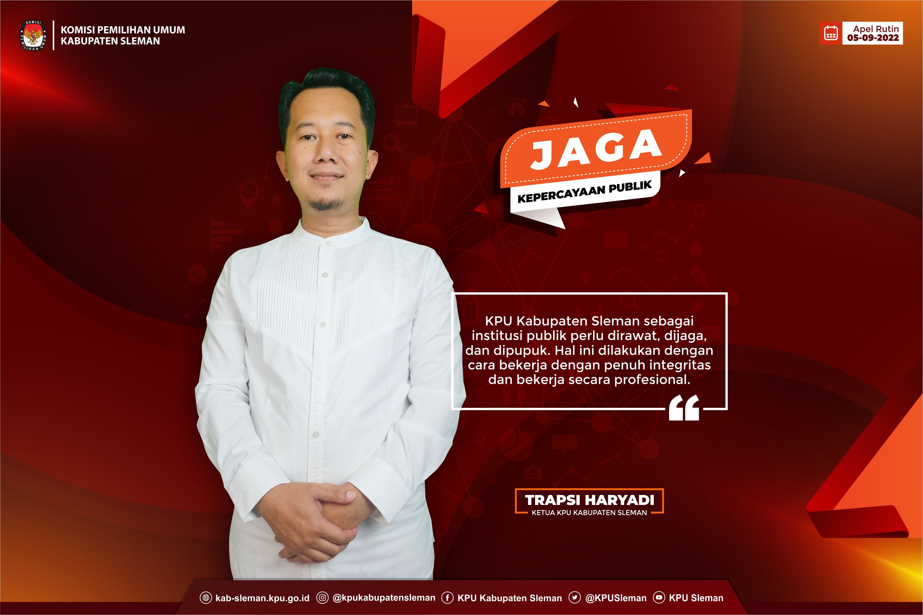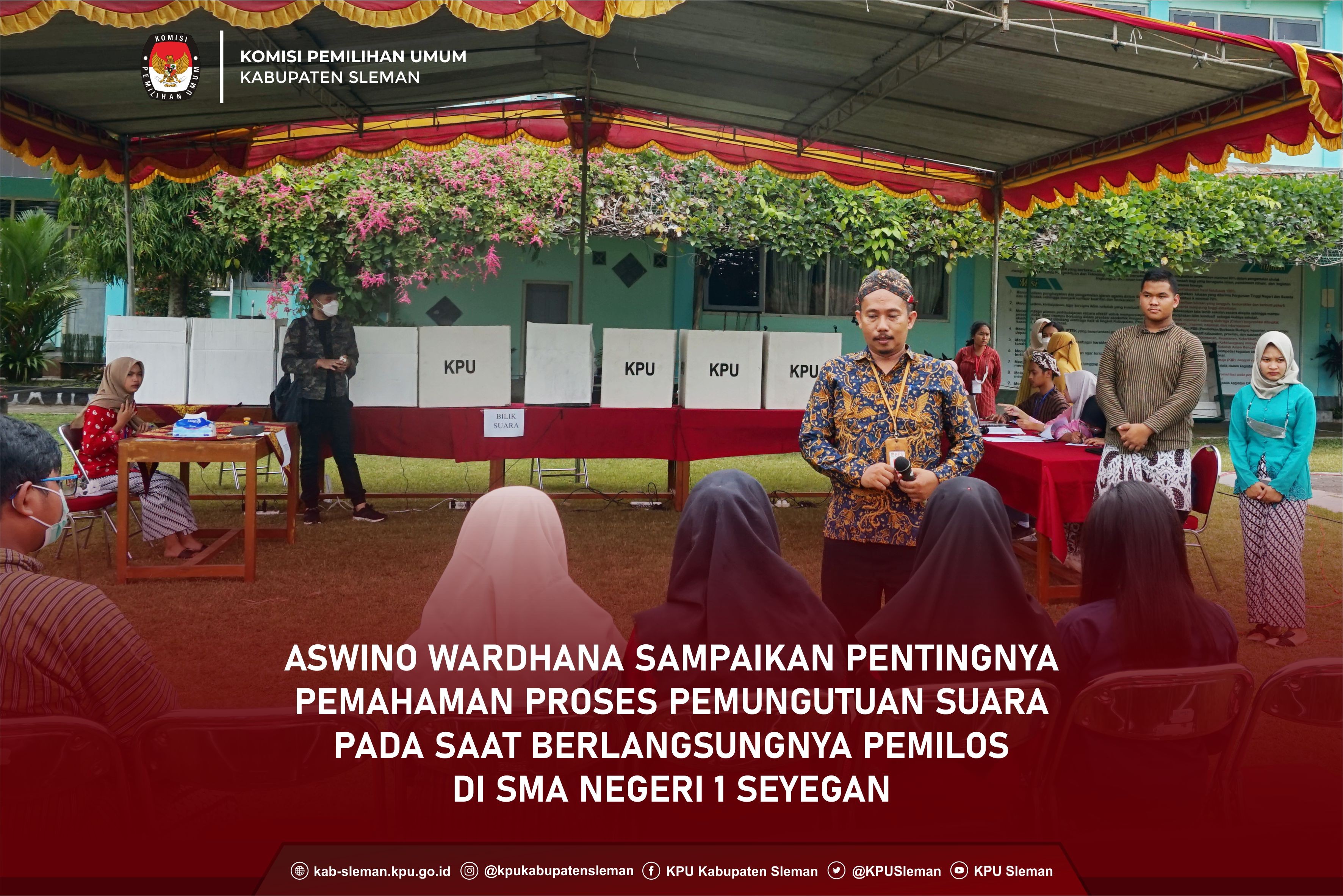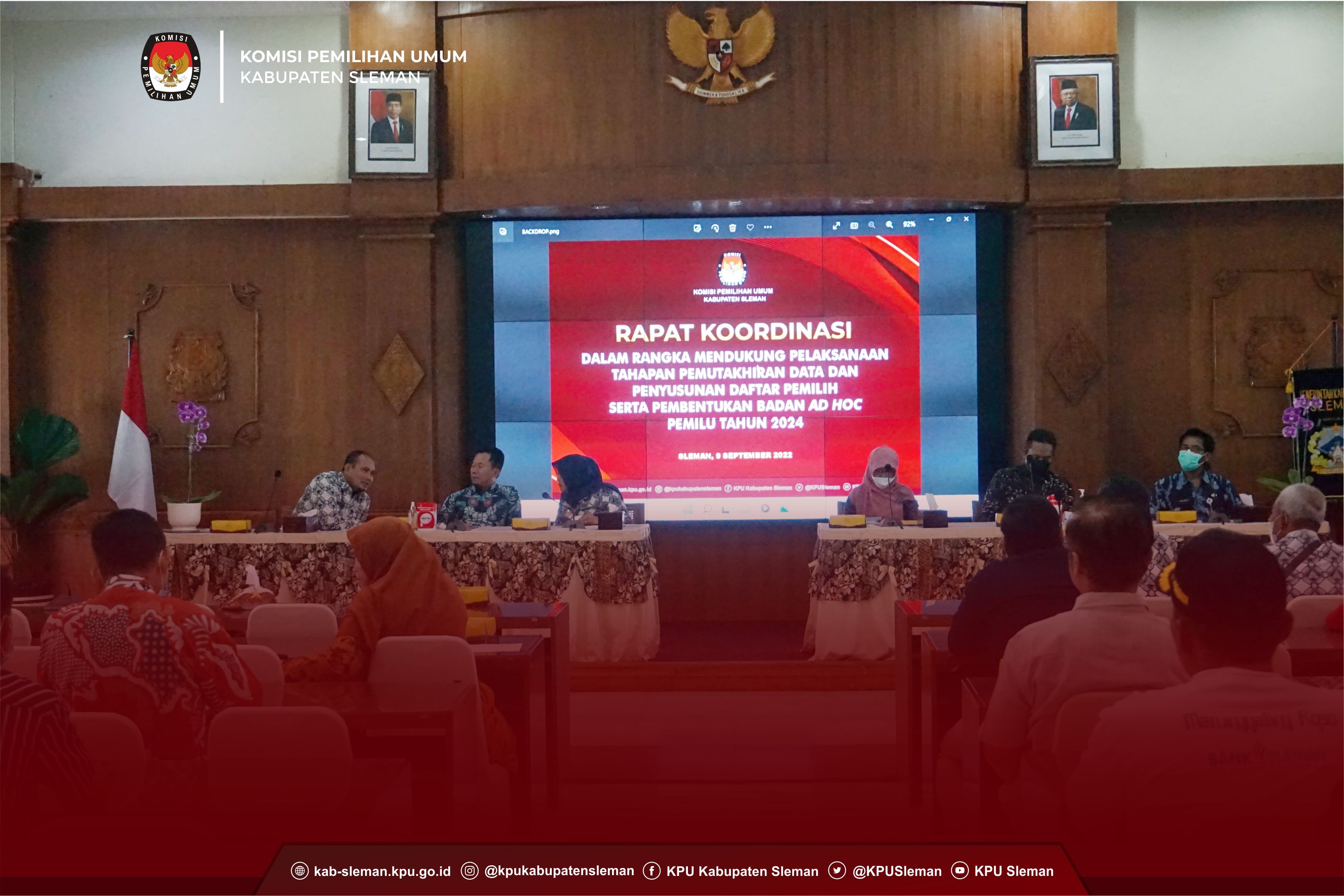 Sleman (09/09) - KPU Kabupaten Sleman menggelar Rapat Koordinasi dalam Rangka Mendukung Pelaksanaan Tahapan Pemutakhiran Data dan Penyusunan Daftar Pemilih serta Pembentukan Badan Ad hoc Pemilu Tahun 2024 secara luring bertempat di Aula lantai 3 Sekretariat Daerah Kabupaten Sleman. Rapat koordinasi dihadiri Bupati Sleman, Kepala Dinas Pemberdayaan Masyarakat dan Kalurahan Kabupaten Sleman, Kepala Bagian Prokompim Kabupaten Sleman, Lurah se-Kabupaten Sleman, Pengurus Harian Paguyuban Dukuh Cokro Pamungkas, serta perwakilan Dukuh di 17 Kapanewon se-Kabupaten Sleman. dok. foto Peserta kegiatan rapat koordinasi Kegiatan rapat koordinasi diawali dengan sambutan dari Trapsi Haryadi selaku Ketua KPU Kabupaten Sleman. Beliau menegaskan bahwasanya pelaksanaan tahapan pemutakhiran dan penyusunan daftar pemilih untuk menjamin hak politik warga Sleman yang telah memenuhi syarat memilih dalam Pemilu Tahun 2024 memerlukan dukungan stakeholder dari tingkat Pemerintah Kabupaten Sleman sampai dengan Lurah dan Dukuh se-Kabupaten Sleman. Disampaikan pula terkait pembentukan badan penyelenggara ad hoc PPK dan PPS juga membutuhkan dukungan dari Pemerintah Kabupaten Sleman dan ucapan terima kasih atas support dan kerjasama stakeholder terkait. Dalam pertemuan tersebut, Bupati Sleman, Kustini Sri Purnomo siap mendukung dan memfasilitasi KPU Kabupaten Sleman dalam pelaksanaan Pemilu Tahun 2024. Dinas Pemberdayaan Masyarakat dan Kalurahan Kabupaten Sleman juga siap mendukung KPU Kabupaten Sleman dalam menyongsong Pemilu Tahun 2024. dok. foto Ketua KPU Kab Sleman beri sambutan di depan peserta Dok. foto Narasumber Rapat Koordinasi Selanjutnya rapat koordinasi dipandu Ketua Divisi Perencanaan Data dan Informasi, Indah Sri Wulandari. Indah menyampaikan bahwa menindaklanjuti Surat Edaran Komisi Pemilihan Umum Nomor 17 Tahun 2022 tentang Tindak Lanjut Hasil Pemadanan Data Pemilih Berkelanjutan Semester II Tahun 2021 Komisi Pemilihan Umum dengan Data Kependudukan Kementerian Dalam Negeri Republik Indonesia, KPU Kabupaten Sleman melakukan konfirmasi data hasil pemadanan melalui Lurah dan Dukuh se-Kabupaten Sleman. Data tersebut berupa data hasil pemadanan Data Pemilih Berkelanjutan Semester II Tahun 2021 antara KPU dengan Data Kependudukan Kementerian Dalam Negeri Republik Indonesia dan hasil verifikasi dengan Dinas Kependudukan dan Pencatatan Sipil Kabupaten Sleman. Pelaksanaan konfirmasi data hasil pemadanan melalui Lurah dan Dukuh se-Kabupaten Sleman merupakan salah satu upaya untuk mewujudkan data pemilih yang lebih akurat, mutakhir, dan kompehensif dalam Pemilu Tahun 2024 mendatang. dok. foto Kadiv Perdatin saat sampaikan materi Indah Sri Wulandari menyampaikan sosialisasi di penghujung acara untuk menambah informasi kepada seluruh peserta rapat yang hadir. Dalam sosialisasi tersebut dikenalkan tentang cek data pemilih mandiri dengan membuka laman https://lindungihakmu.kpu.go.id/ atau dengan mengunduh aplikasi Lindungihakmu di Google Playstore. Dalam kesempatan tersebut, Indah juga melakukan simulasi pengecekan apakah sudah terdaftar di daftar pemilih yang ditujukan kepada peserta rapat yang hadir. (Andi)