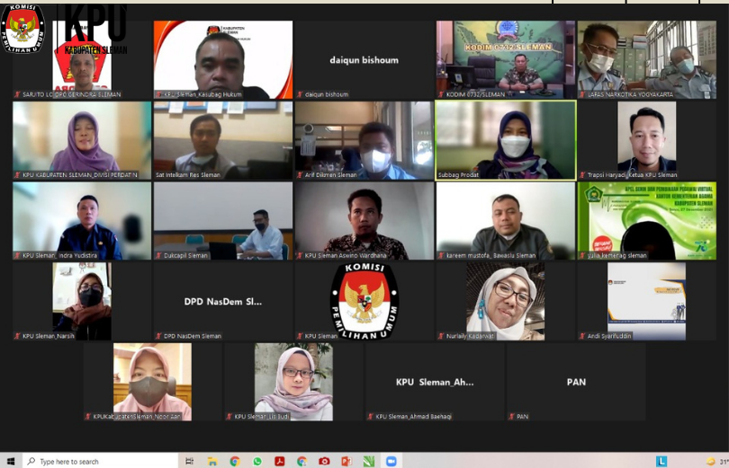 Sleman (05/01) - KPU Kabupaten Sleman pada hari Selasa (28/12) menggelar Rapat Koordinasi Pemutakhiran Data Pemilih Berkelanjutan Tahun 2021 Triwulan IV sekaligus Sosialisasi PKPU Nomor 6 Tahun 2021 tentang Pemutakhiran Data Pemilih Berkelanjutan secara daring melalui pranala zoom cloud meeting. Rapat koordinasi dihadiri Polres Sleman, Kodim 0732/Sleman, Lembaga Pemasyarakatan Narkotika Kelas IIA Yogyakarta, Dinas Kependudukan dan Pencatatan Sipil (Disdukcapil) Kabupaten Sleman , Balai Pendidikan Menengah Kabupaten Sleman, Kantor Kementerian Agama Kabupaten Sleman, Bawaslu Kabupaten Sleman, Partai Gerakan Indonesia Raya (Gerindra), Partai Nasdem, Partai Amanat Nasional (PAN). Kegiatan rapat koordinasi pemutakhiran data pemilih berkelanjutan dengan mengundang stakeholder dan partai politik ini merupakan agenda rutin KPU Kabupaten Sleman setiap triwulan.