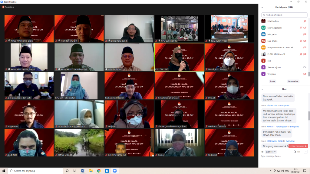 Seluruh jajaran KPU Kabupaten Sleman menghadiri kegiatan Halal Bihalal di lingkungan KPU Se-daerah Istimewa Yogyakarta secara daring. Acara Halal Bihalal yang diselenggarakan oleh KPU D.I.Yogyakarta dihadiri oleh seluruh jajaran KPU Kabupaten/Kota se- DIY. Pimpinan KPU RI juga turut bergabung dalam acara ini diantaranya Ketua KPU RI Ilham Saputra serta dua pimpinan KPU RI lain yakni Arief Budiman dan I Dewa Kade Wiarsa Raka Sandi. Dalam arahan Ketua KPU RI Ilham Saputra disampaikan bahwa momentum Idul Fitri hendaknya dijadikan sebagai penyemangat dan menjadikan kita semua lebih baik dalam bekerja khususnya dalam menyelenggarakan Pemilu serentak 2024 mendatang. dof. foto Arahan KPU RI Ilham Saputra dok. foto Pembacaan Ikrar Syawalan Dalam acara halal bihalal ini juga disampaikan ikrar syawalan oleh Ketua KPU DIY Hamdan Kurniawan beserta Ketua KPU seluruh Kabupaten/Kota. dok. foto Sambutan Ketua KPU DIY Hamdan Kurniawan Ketua KPU DIY Hamdan Kurniawan berharap bahwa halal bihalal meskipun masih dalam masa pandemi dan hanya dilakukan secara daring tetap tidak mengurangi makna untuk saling menyampaikan maaf serta memberikan maaf. (Nars)