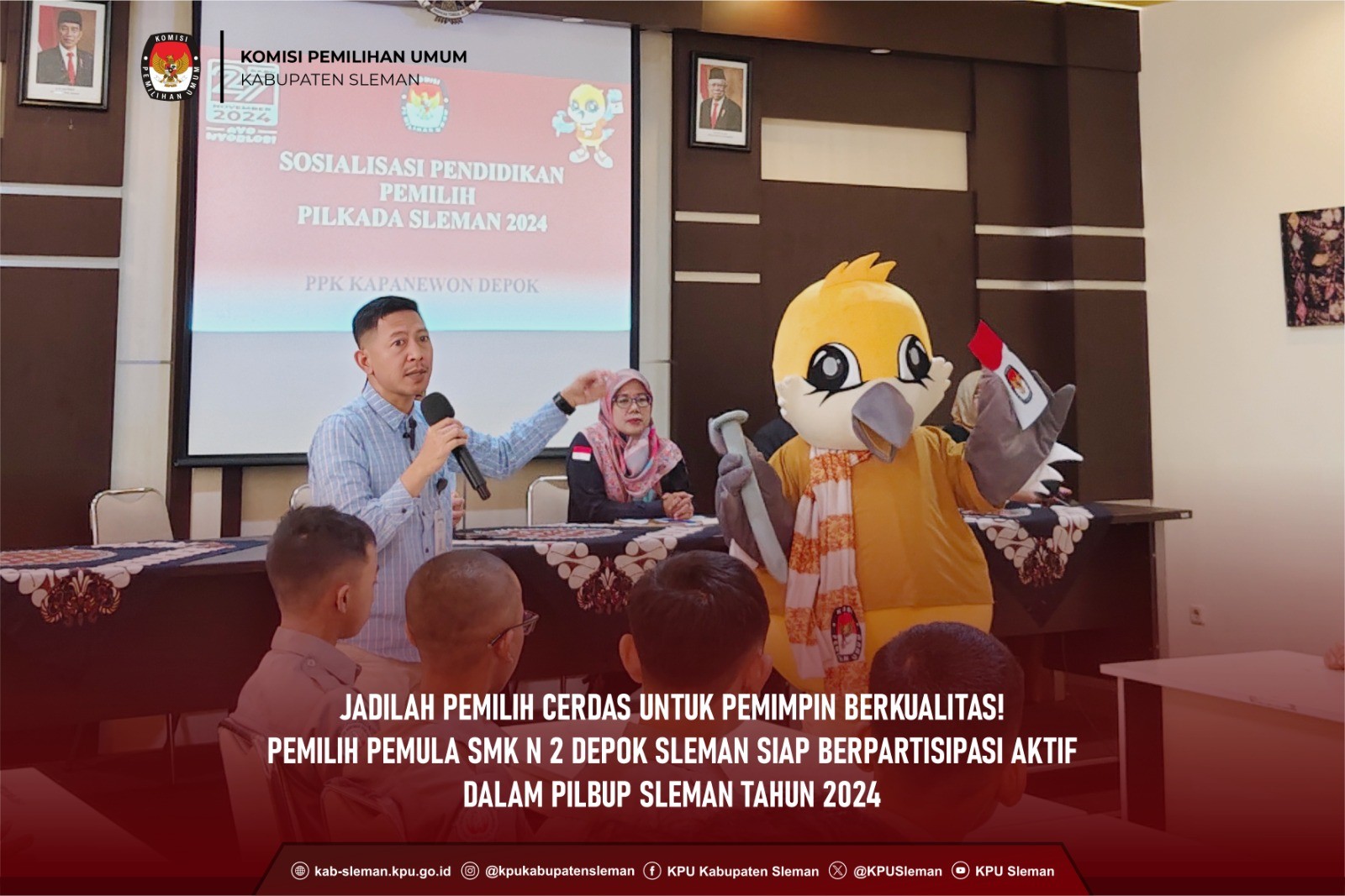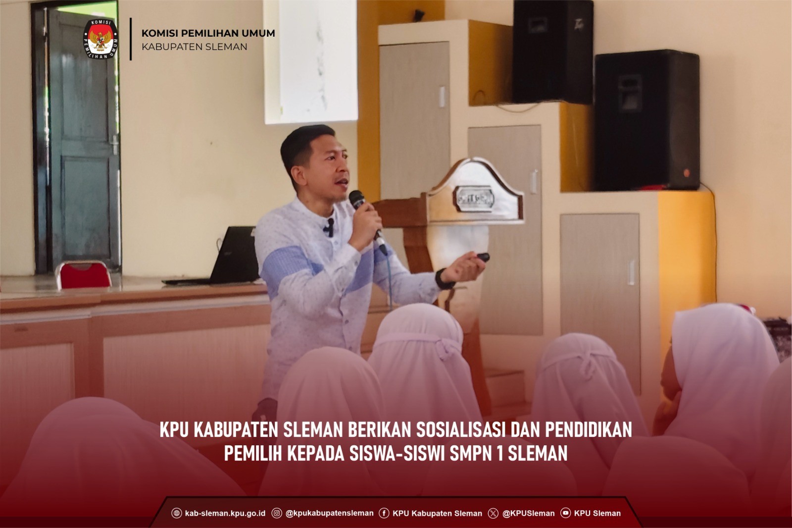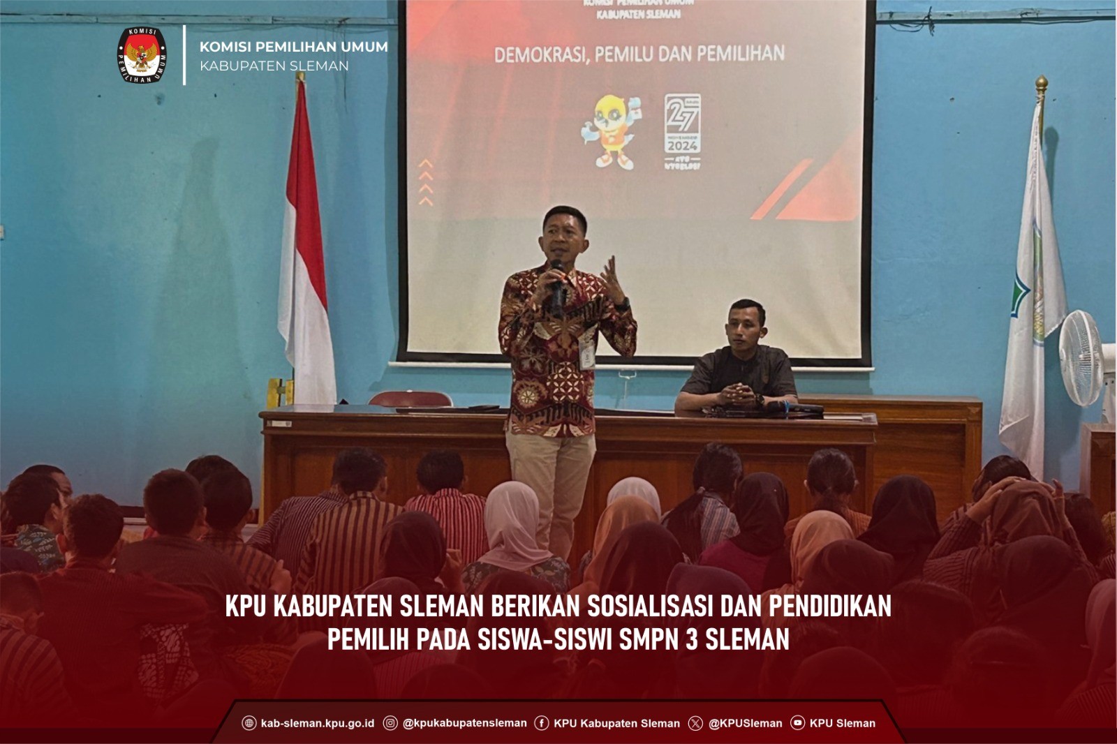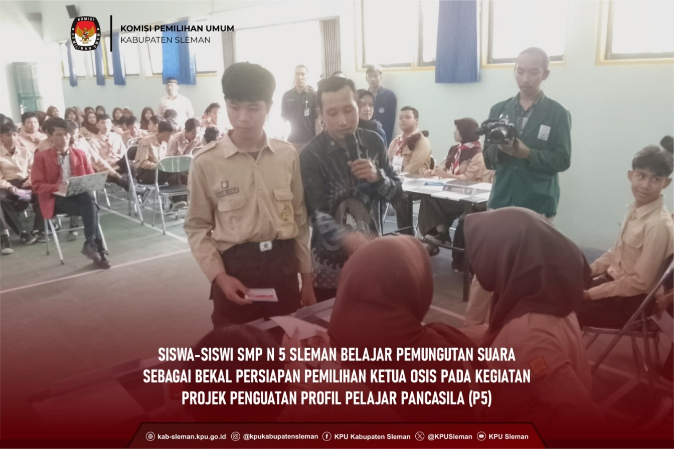 Sleman (25/08) - KPU Kabupaten Sleman melaksanakan Sosialisasi dan Pendidikan Pemilih di SMPN 1 Sleman bersama PPK Kapanewon Sleman dan PPS Divisi Sosialisasi dan Pendidikan Pemilih se-Kapanewon Sleman pada Senin (26/08) pukul 10.30 WIB. Kegiatan tersebut dihadiri oleh siswa-siswi kelas VII dan perwakilan guru SMPN 1 Sleman dengan tujuan memberikan pengetahuan dasar untuk membentuk pola pikir yang kuat mengenai demokrasi dan kepemiluan bagi para siswa. Dok. foto Peserta sosialisasi SMP N 1 Sleman Dalam kegiatan tersebut, Huda Al Amna selaku Ketua Divisi Sosialisasi dan Pendidikan Pemilih, Partisipasi Masyarakat, dan SDM memaparkan materi terkait demokrasi dan pilkada. Demokrasi merupakan sistem pemerintahan yang berasal dari rakyat, dijalankan oleh rakyat, dan ditujukan untuk kepentingan rakyat. Sementara itu, pilkada adalah proses pemilihan kepala daerah yang merupakan salah satu bentuk penerapan demokrasi di tingkat lokal, dalam hal ini pada wilayah Kabupaten Sleman hanya menyelenggarakan Pemilihan Bupati dan Wakil Bupati. Kedua hal ini saling berkaitan karena partisipasi kita dalam proses tersebut turut memengaruhi kebijakan pemerintah yang akan diterapkan dalam kehidupan sehari-hari. Lebih lanjut, Huda menyampaikan cara berpartisipasi dalam pilkada bagi siswa yang belum mencapai usia 17 tahun, yaitu dengan menyebarkan informasi seluas-luasnya, setidaknya mengenai tanggal Pilkada Tahun 2024, kepada teman, tetangga, atau keluarga. dok. foto Penyampaian sosialisasi oleh anggota PPK Kapanewon Sleman Memasuki sesi pemaparan materi kedua yang dilakukan Mursyid Nurhidayat selaku Anggota PPK Sleman menyampaikan dua tahapan pilkada yang sudah diatur dalam Peraturan KPU Nomor 2 Tahun 2024, diantaranya tahapan persiapan dan tahapan penyelenggaraan. Selain itu, Mursyid memaparkan jadwal tahapan Pemilihan Bupati dan Wakil Bupati Sleman Tahun 2024 yang saat ini sudah sampai pada tahapan pendaftaran pasangan calon Bupati dan Wakil Bupati Sleman. ddok. foto Simulasi Pemungutan Suara oleh siswa siswi SMP N 1 Sleman Kegiatan dilanjutkan dengan simulasi pemungutan suara yang dipandu oleh Anis, Anggota PPS Caturharjo. Beberapa siswa turut serta dalam simulasi tersebut dengan berperan sebagai petugas KPPS, Linmas, pengawas TPS, saksi dari partai politik, dan pemilih. Dalam pelaksanaan simulasi, Anis menyampaikan informasi terkait tugas masing-masing panitia dan tata cara pemungutan suara di TPS. dok. foto Peserta aktif mendapatkan mercahdise KPU Sleman Sesi diskusi interaktif dilaksanakan pada penghujung materi dengan hadiah menarik dari KPU Kabupaten Sleman sebagai apresiasi bagi siswa yang ikut berpartisipasi dalam sesi tersebut. Sosialisasi dan Pendidikan Pemilih tersebut diakhiri dengan pengenalan GEMATI sebagai maskot Pilkada KPU Kabupaten Sleman Tahun 2024 . (Af)