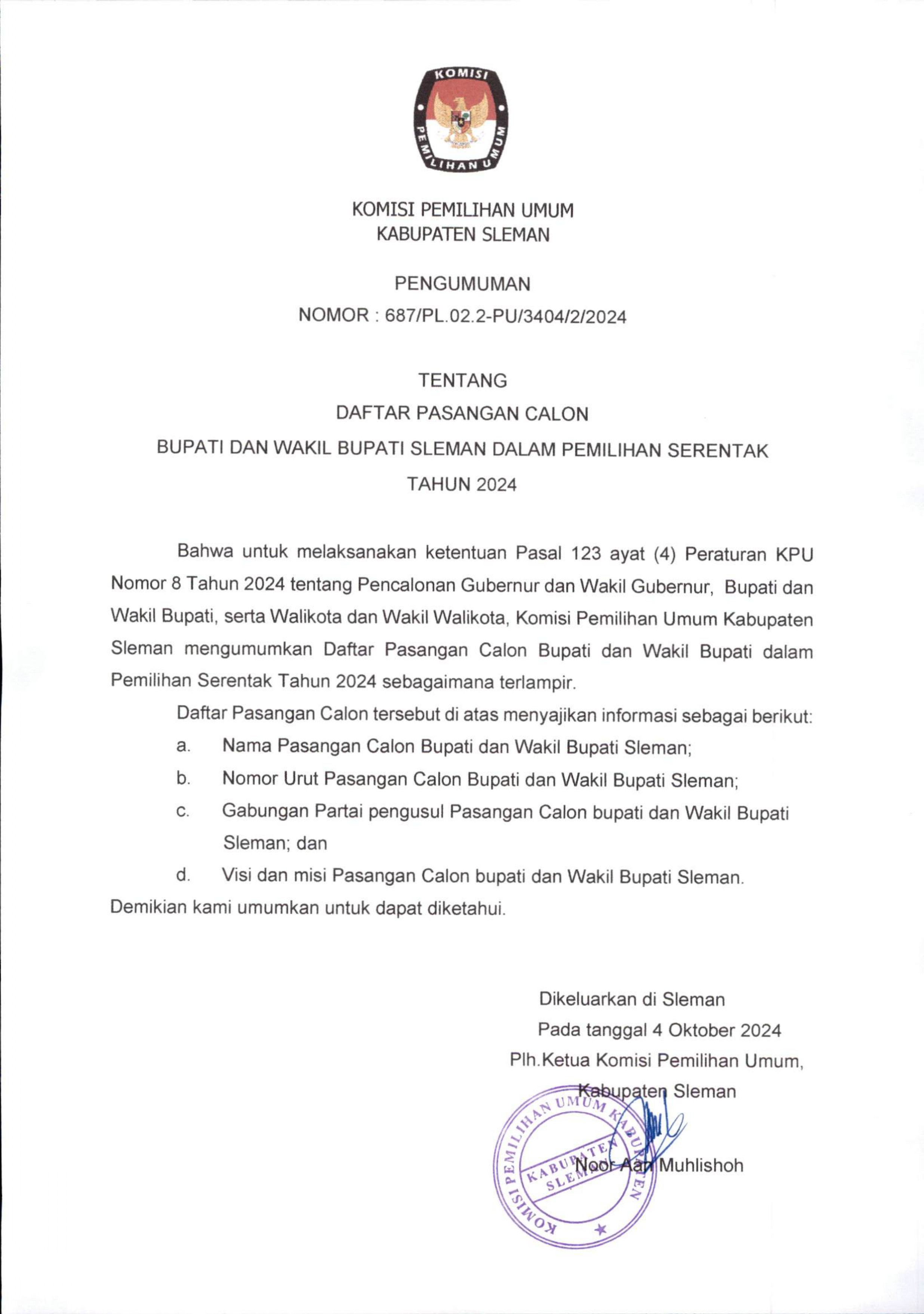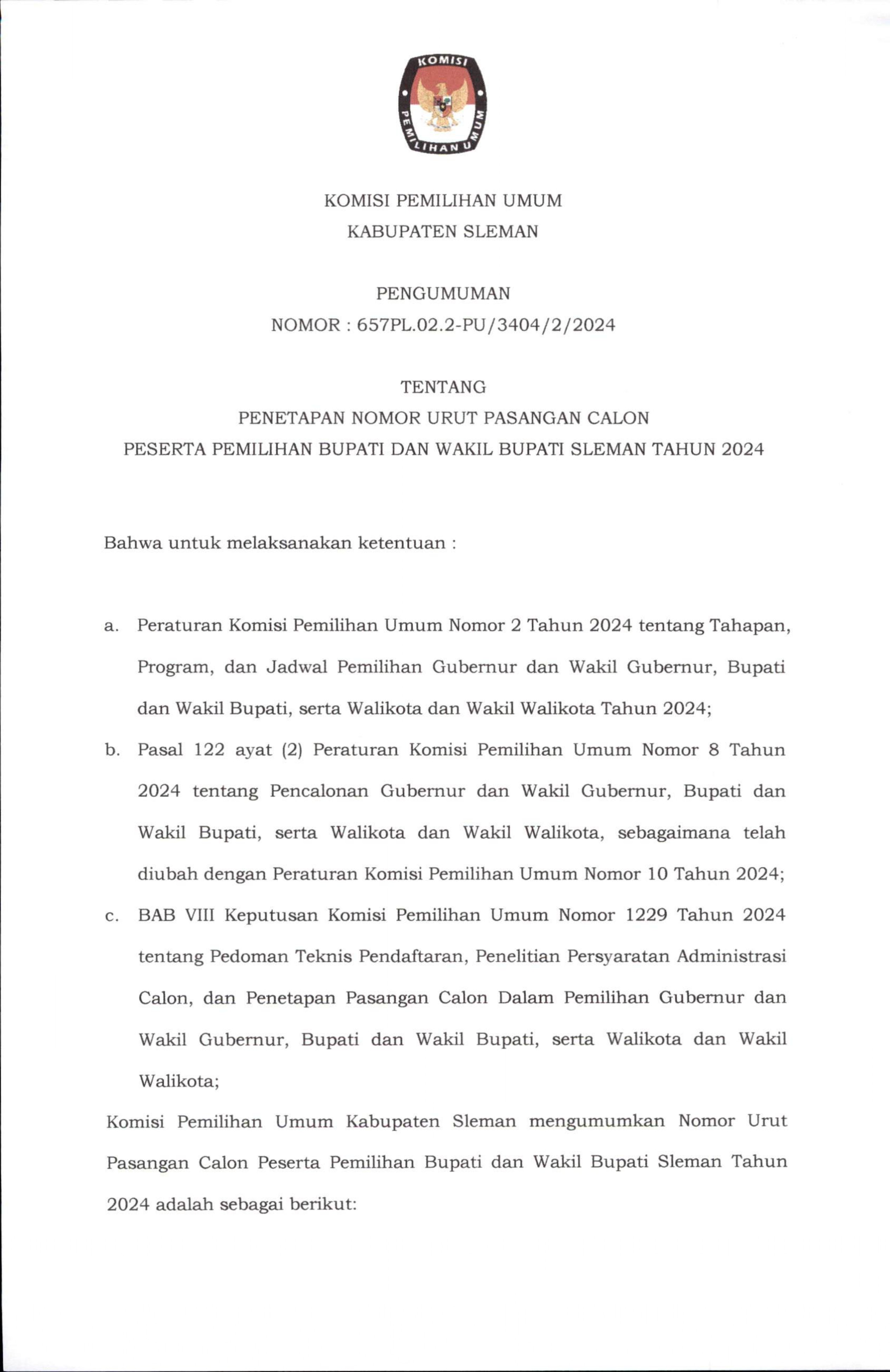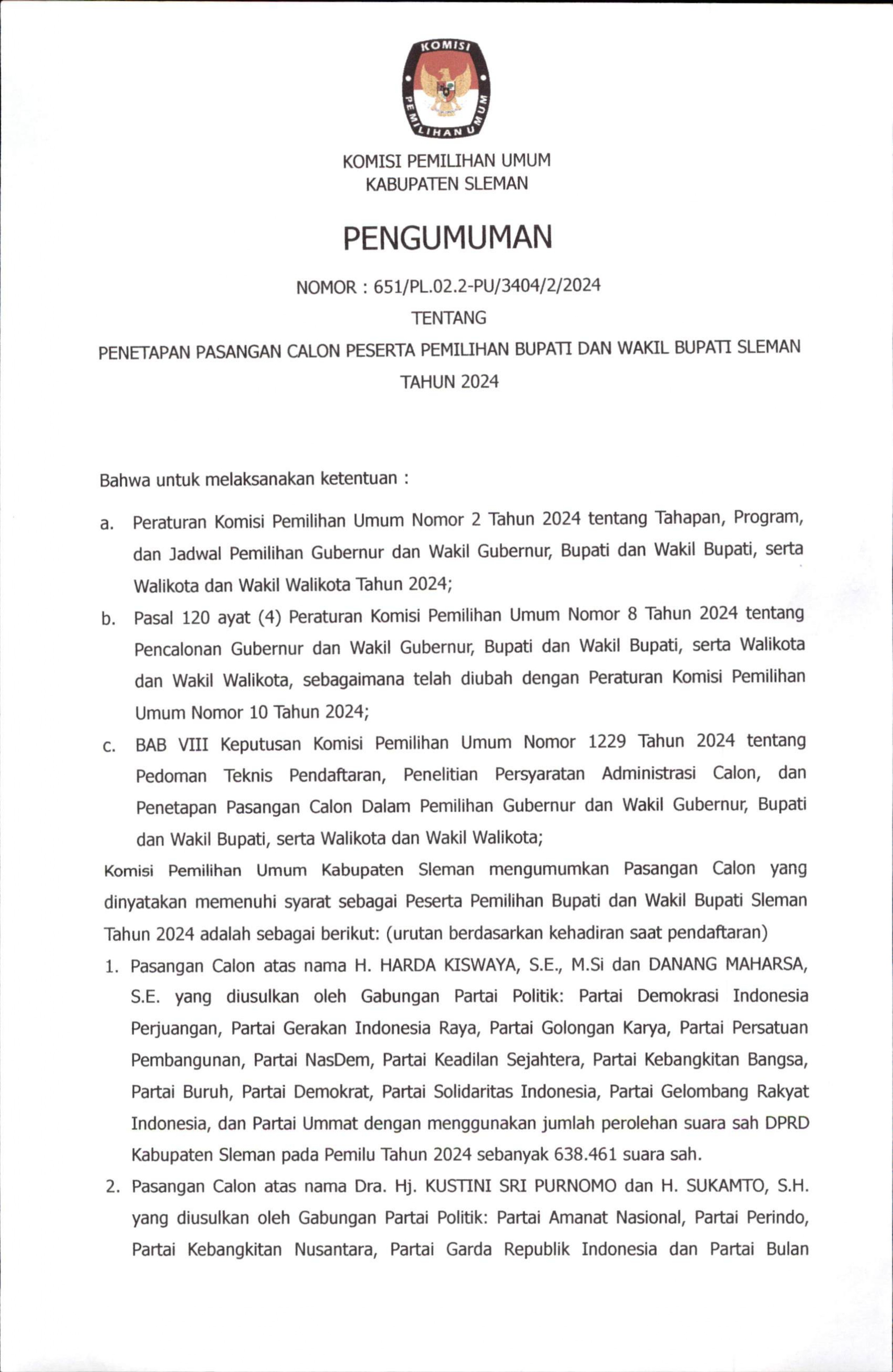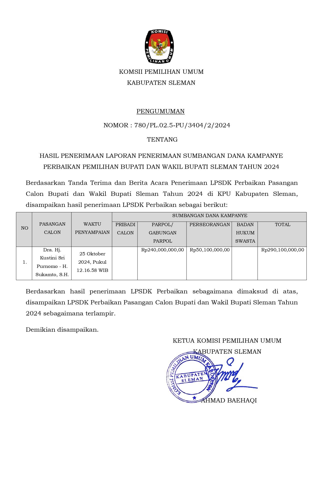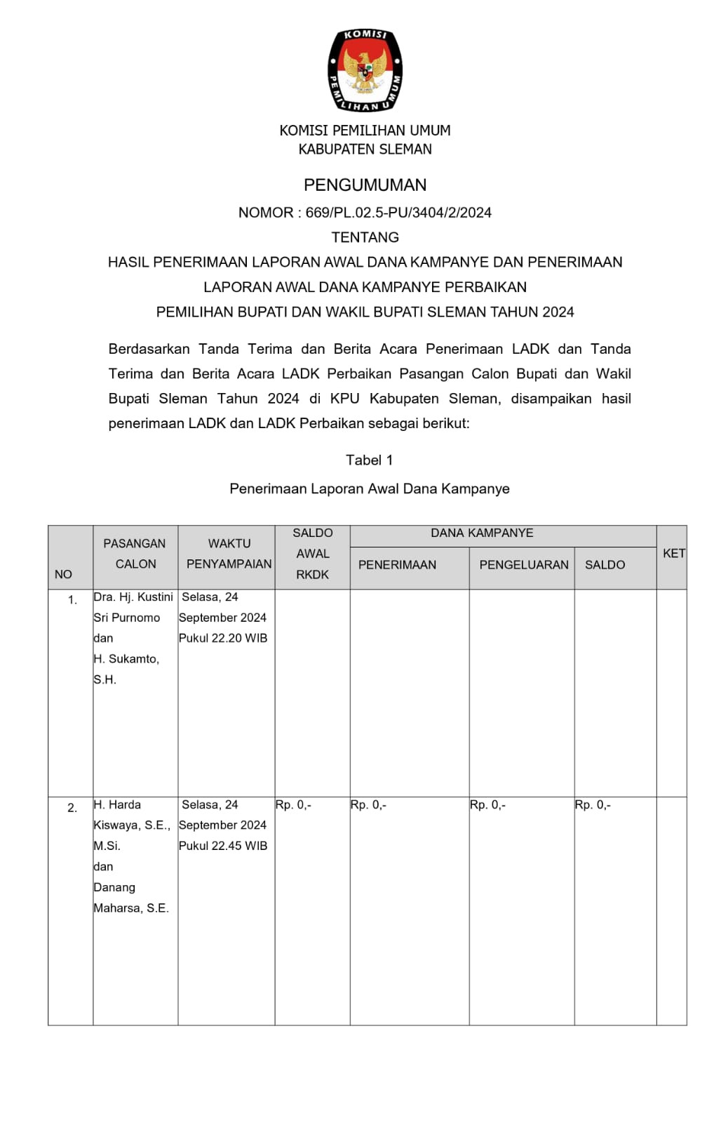 Pengumuman KPU Kabupaten Sleman Nomor 669/PL.02.5-PU/3404/2/2024 Tentang Hasil Penerimaan Laporan Awal Dana Kampanye dan Penerimaan Laporan Awal Dana Kampanye Perbaikan Pemilihan Bupati dan Wakil Bupati Sleman Tahun 2024