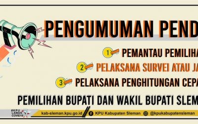 Sleman (01/09) – Sesuai dengan Peraturan Komisi Pemilihan Umum Nomor 3 Tahun 2017 tentang Pencalonan Pemilihan Gubernur dan Wakil Gubernur, Bupati dan Wakil Bupati dan/atau Walikota dan Wakil Walikota sebagaimana telah diubah beberapa kali diubah dengan Peraturan Komisi Pemilihan Umum Republik Indonesia Nomor 1 tahun 2020 dan juga Peraturan Komisi Pemilihan Umum Republik Indonesia Nomor 15 Tahun 2019tentang Tahapan, Program, dan Jadwal Penyelenggaraan Pemilihan Gubernur dan Wakil Gubernur, Bupati dan Wakil Bupati, dan/atau Walikota dan Wakil Walikota Tahun 2020 sebagaimana telah diubah terakhir dengan Peraturan Komisi Pemilihan Umum Republik Indonesia Nomor 5 Tahun 2020. KPU Kabupaten Sleman telah menetapkan Keputusan Komisi Pemilihan Umum Kabupaten Sleman Nomor 21/HK.03.1-Kpt/3404/KPU-Kab/VI/2020 tentang Perubahan Ketiga atas Keputusan Komisi Pemilihan Umum Kabupaten Sleman Nomor 160/HK.03.1-Kpt/KPU-Kab/IX/2019 tentang Pedoman Teknis Tahapan, Program dan Jadwal Penyelenggaraan Pemilihan Bupati dan Wakil Bupati Sleman Tahun 2020. Dalam ketentuan ini tahapan Pencalonan dapat digambarkan melalui info grafis berikut. dok. gambar Infografis Tahapan Pencalonan Pemilihan Bupati dan Wakil Bupati Sleman Tahun 2020 KPU Kabupaten Sleman mengharap partisipasi seluruh masyarakat agar rangkaian tahapan pencalonan dapat berjalan lancar hingga berakhirnya penetapan pasangan calon Bupati dan Wakil Bupati Sleman tahun 2020. (Nars)