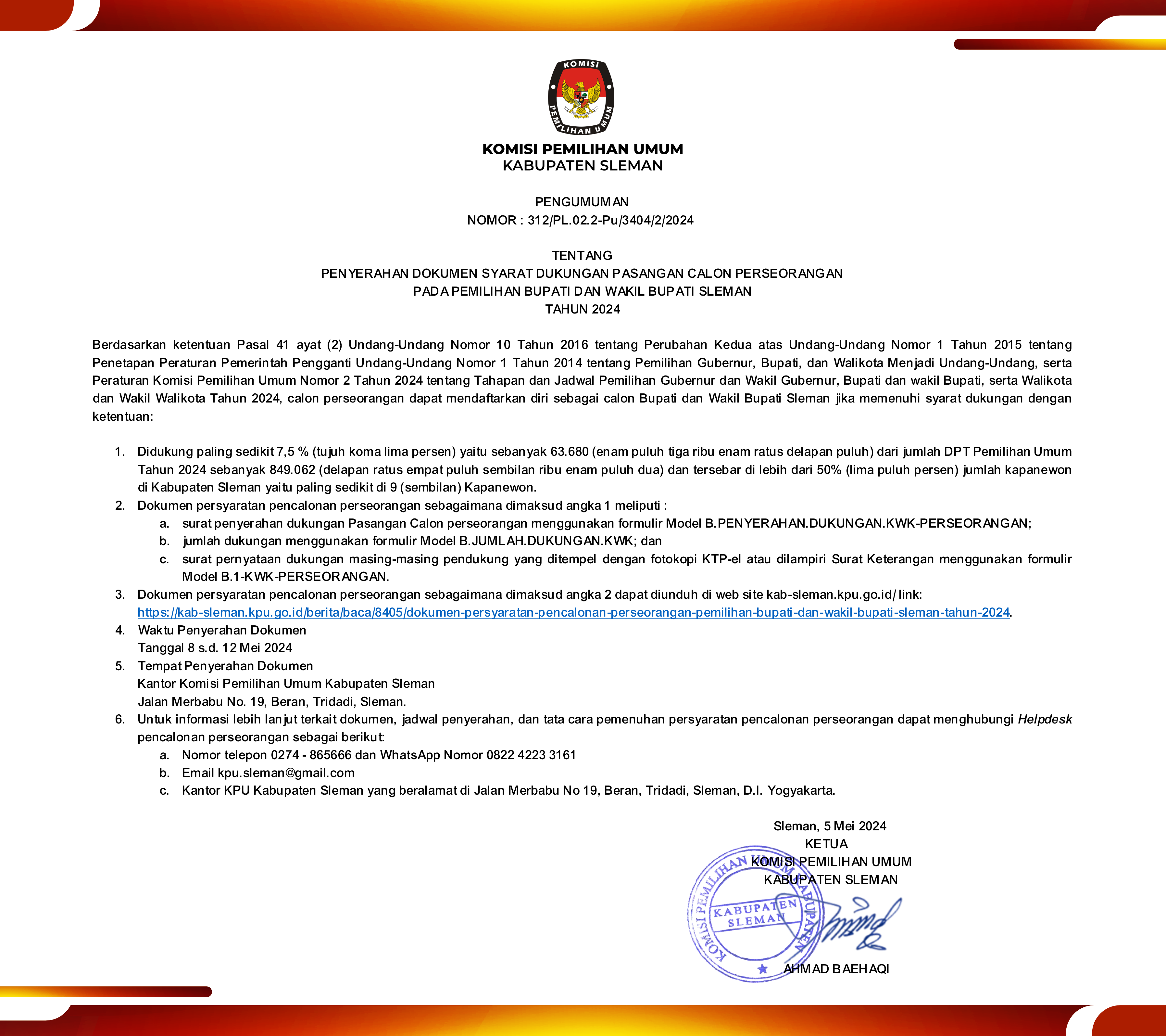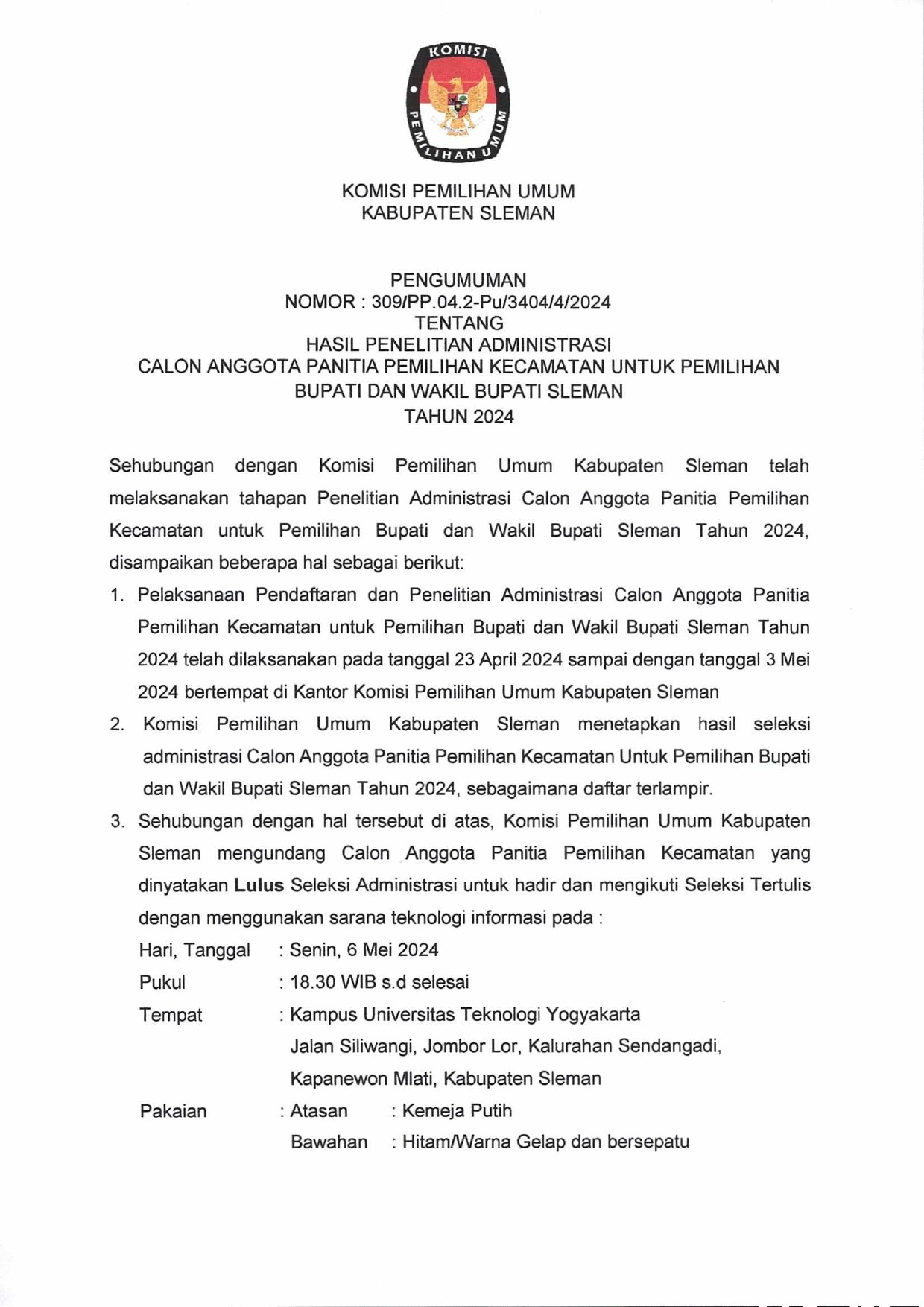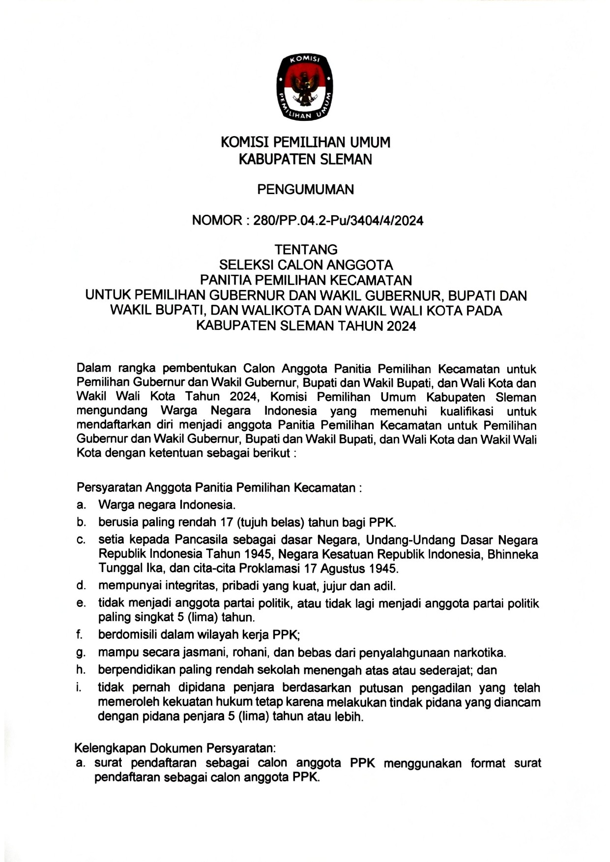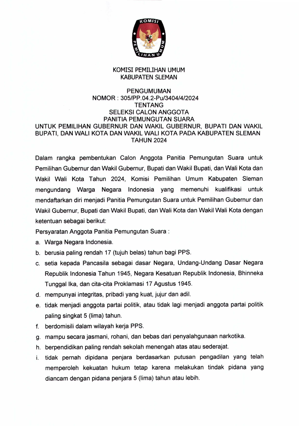 Pengumuman KPU Kabupaten Sleman Nomor 305/PP.04.2-Pu/3404/4/2024 tentang Seleksi Calon Anggota Panitia Pemungutan Suara Untuk Pemilihan Gubernur dan Wakil Gubernur, Bupati dan Wakil Bupati, dan Wali Kota dan Wakil Wali Kota Pada Kabupaten Sleman Tahun 2024.