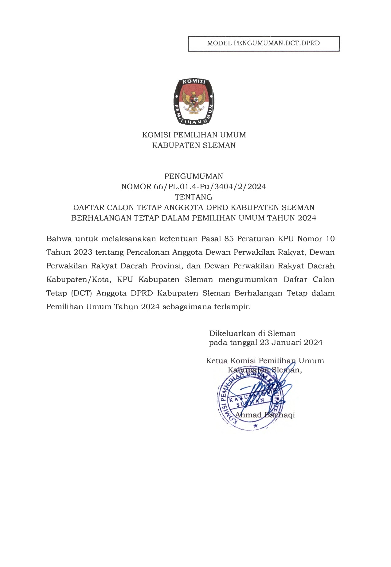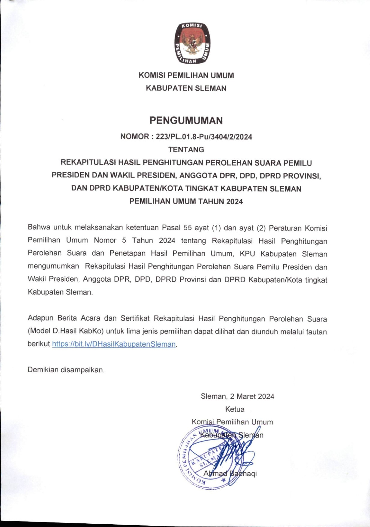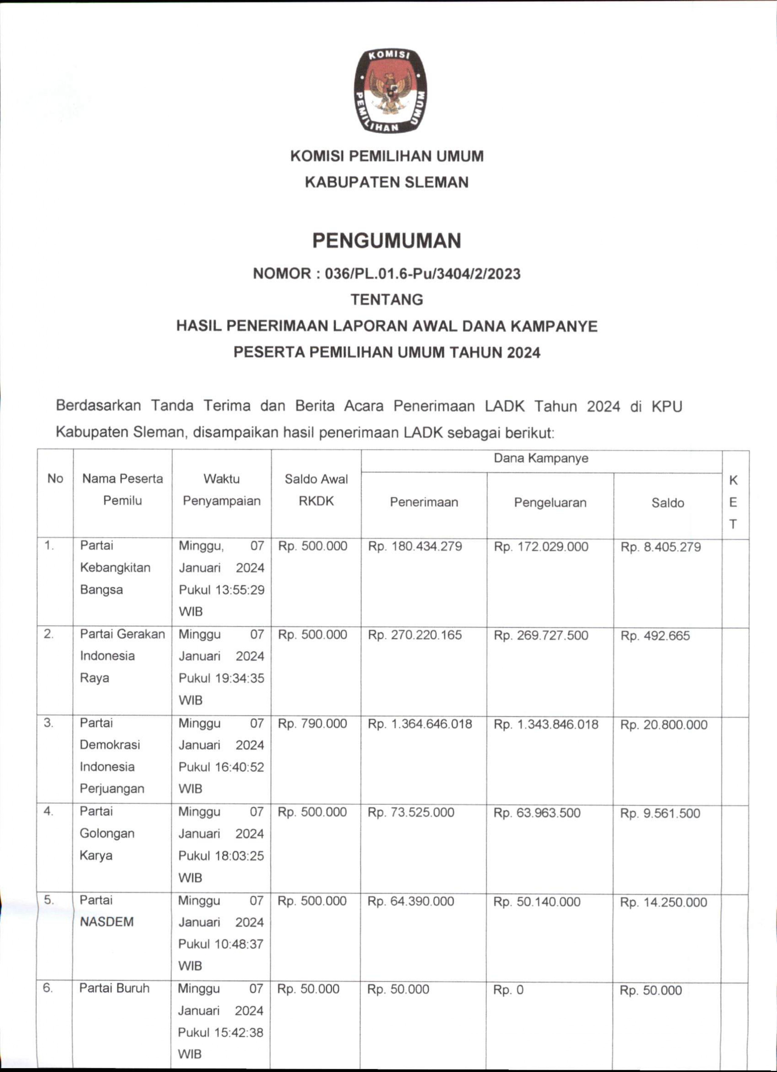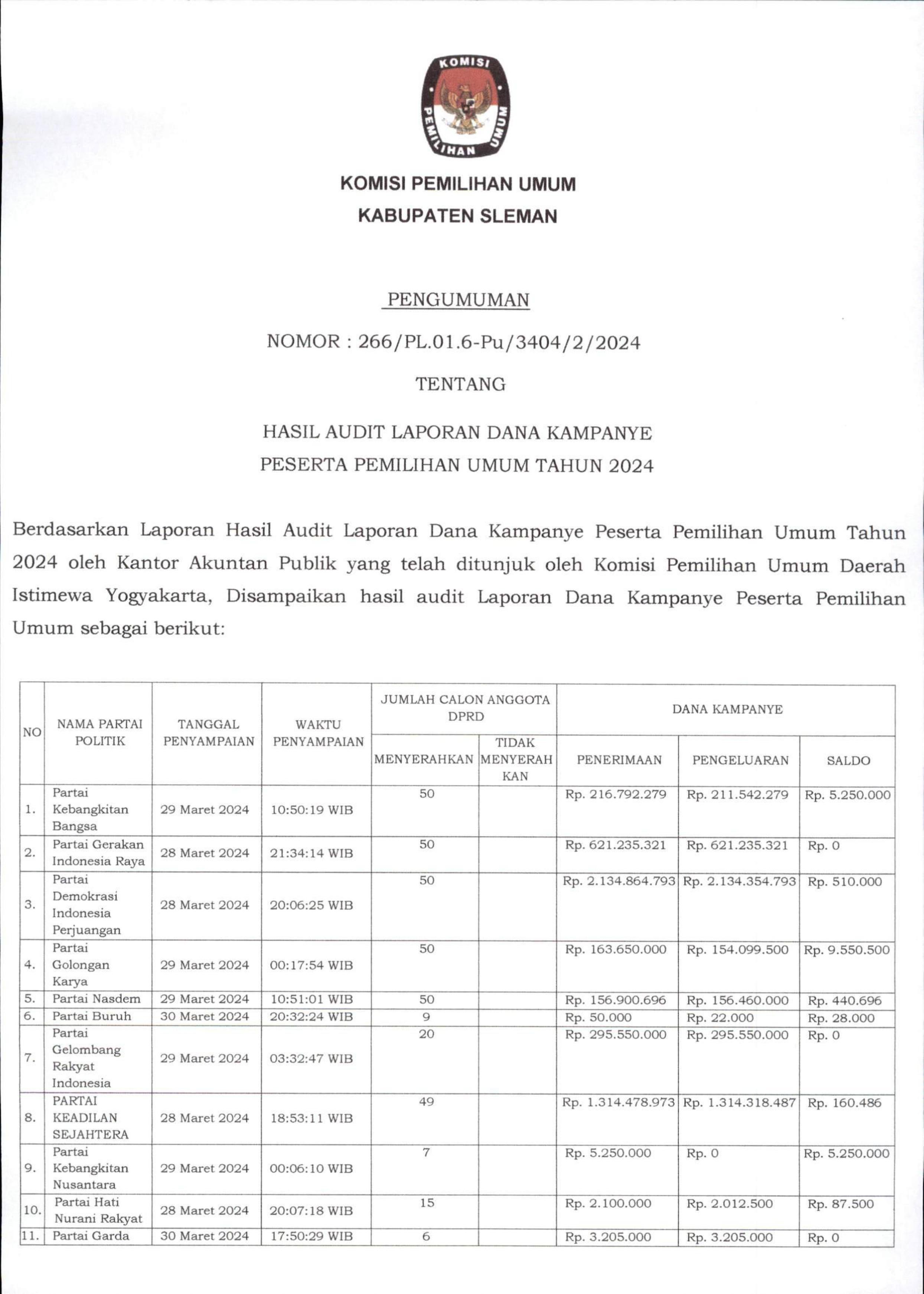 Pengumuman Komisi Pemilihan Umum Kabupaten Sleman Nomor 266/PL.01.6-Pu/3404/2/2024 tentang Hasil Audit Laporan Dana Kampanye Peserta Pemilihan Umum Tahun 2024. Selengkapnya pengumuman dapat diunduh dengan KLIK DI SINI dan untuk lampiran bagi masing-masing partai politik dapat di unduh dengan cara KLIK DI SINI.