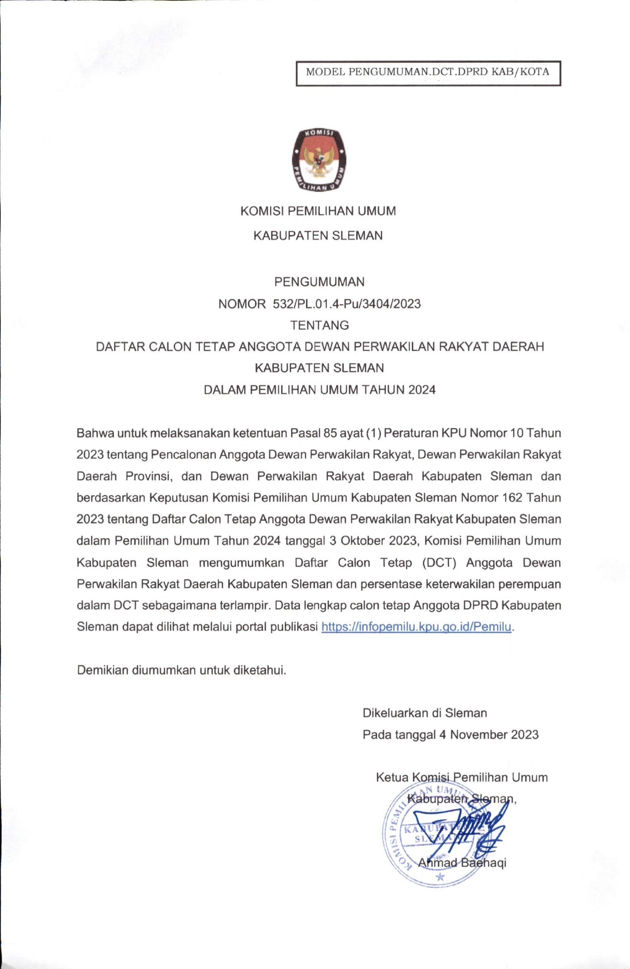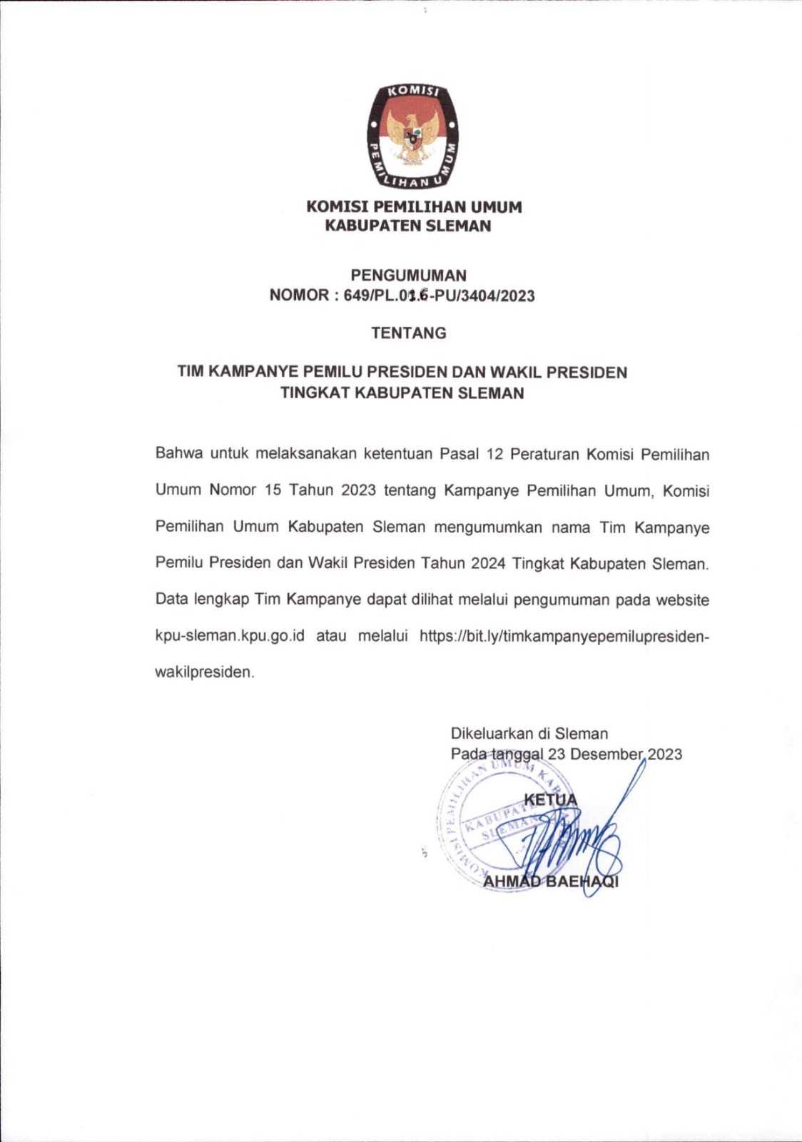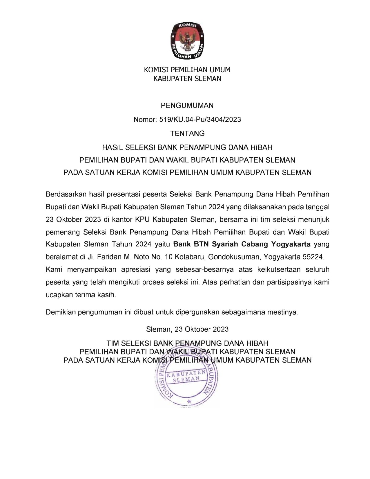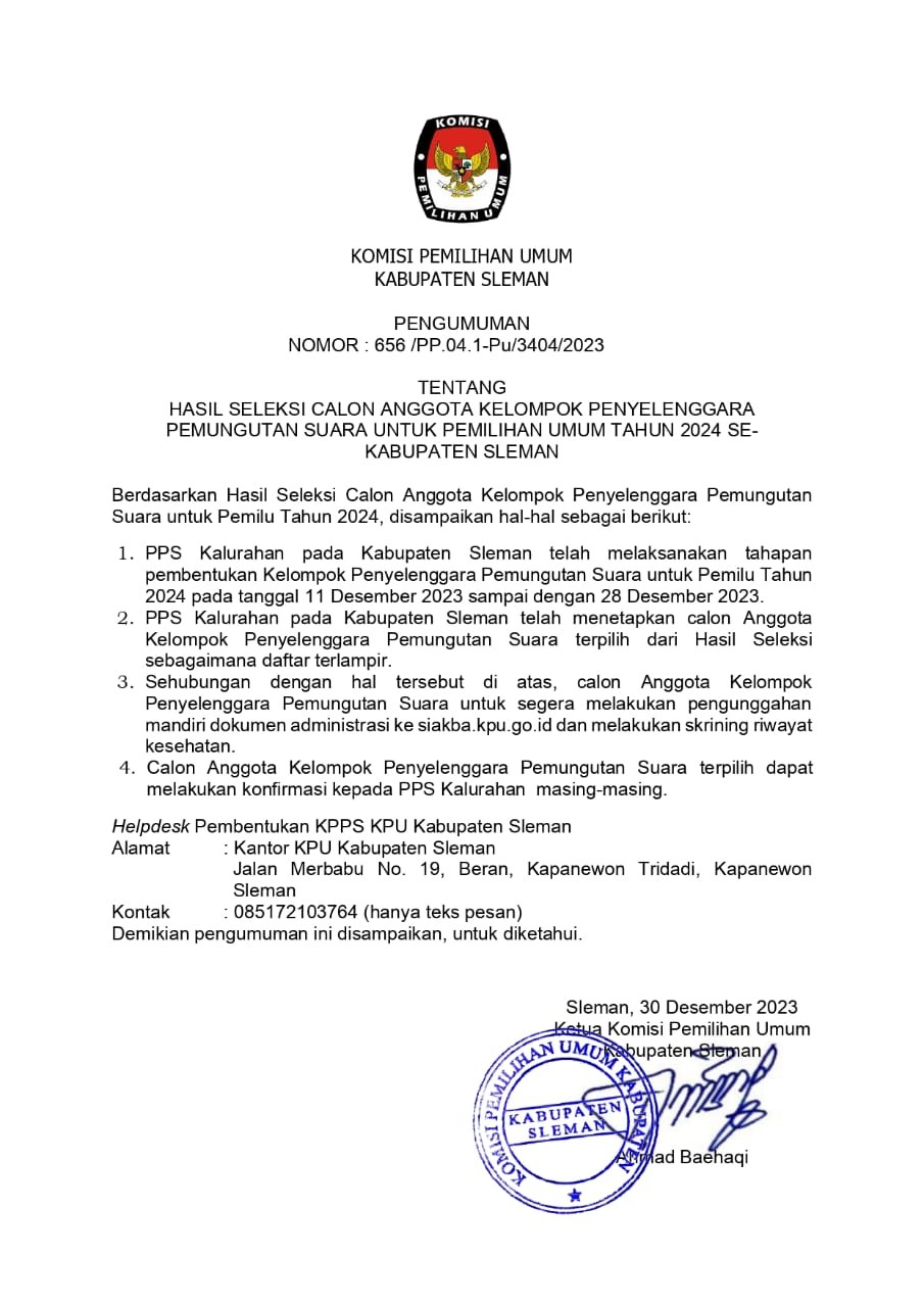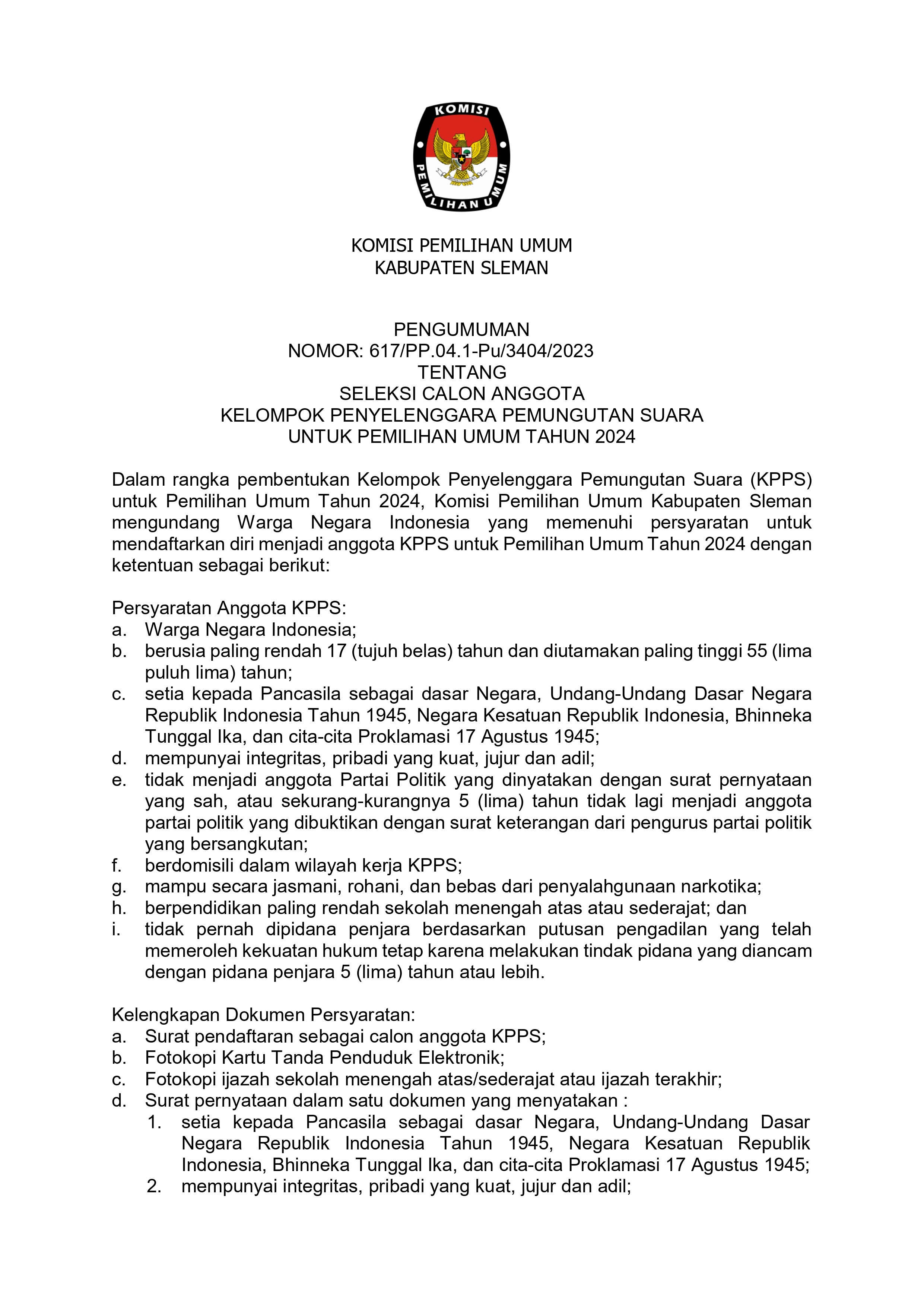 Pengumuman KPU Kabupaten Sleman Nomor : 617/PP.04.1-Pu/3404/2023 tanggal 11 Desember 2023 tentang Seleksi Calon Anggota Kelompok Penyelenggara Pemungutan Suara Untuk Pemilihan Umum 2024.